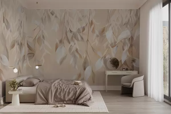 Фототапет Висящи текстурирани бели и бежови листа с мека цветова палитра, праскова, сиво и бяло на деликатен фон Nr w09136