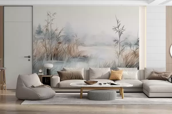 Фототапет Текстуриран пейзаж на езеро с високи треви на преден план, меко синьо и кафяво, спокойна вода, дървета в далечината Nr w09137