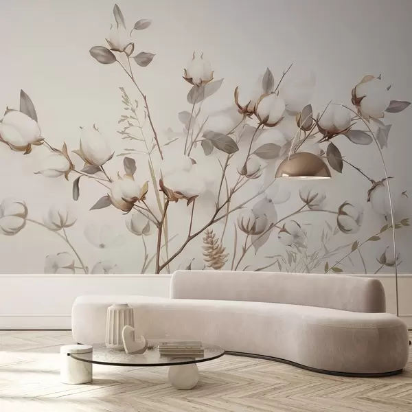 Фототапет Памучни цветя със стъбла и листа в светлокафява цветова палитра, бежов фон, мек и деликатен, акварелен стил Nr w09141