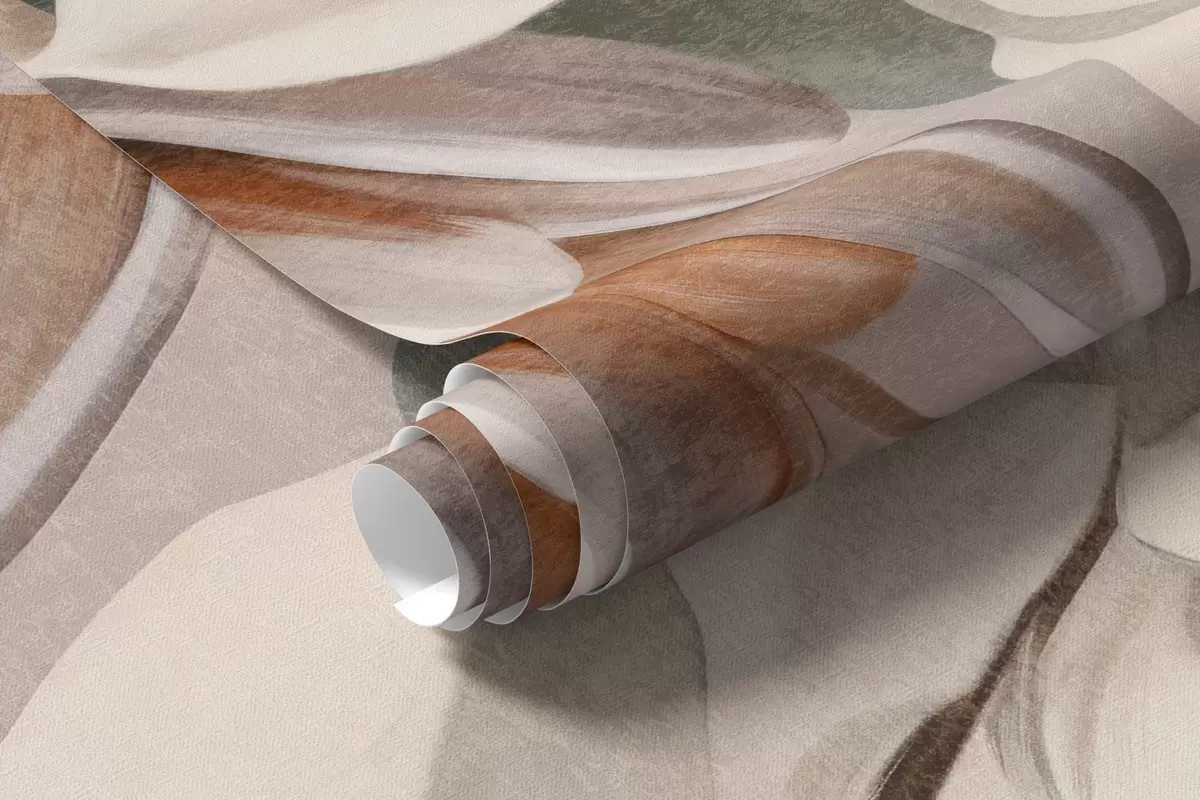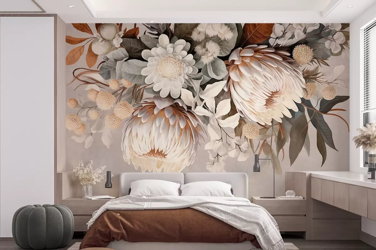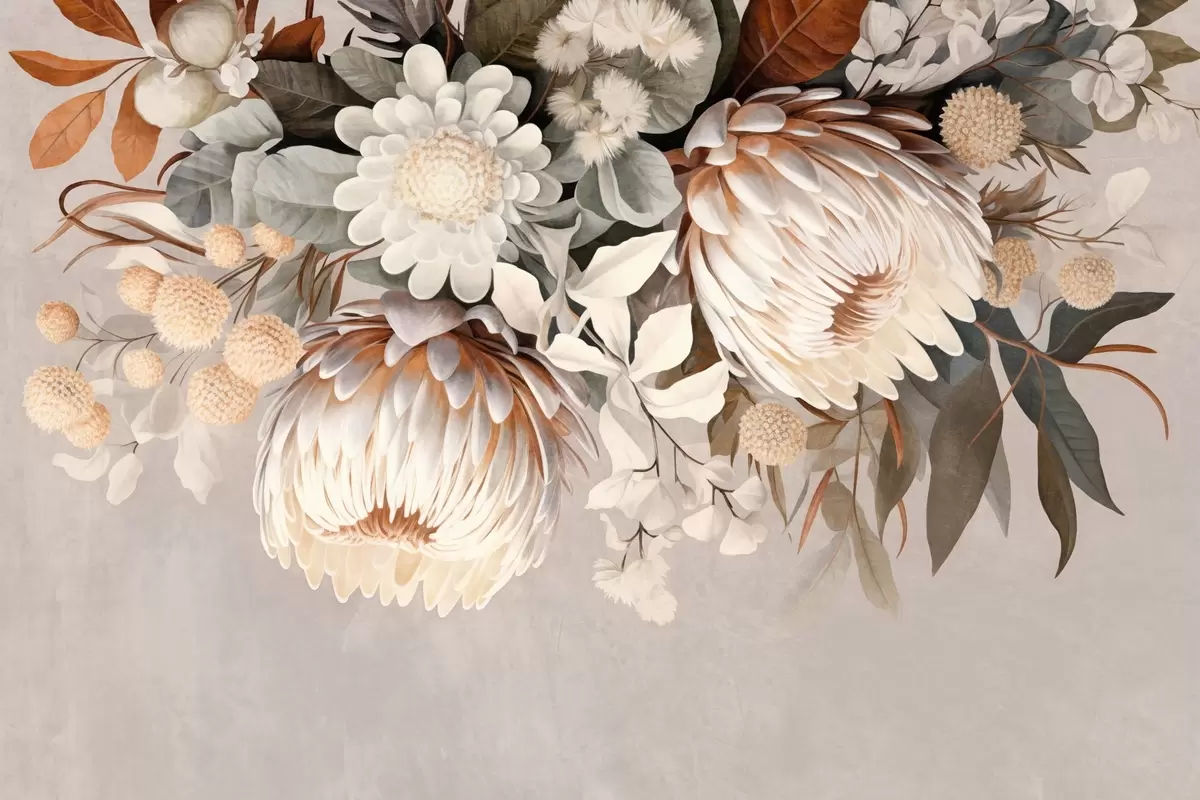 Фототапет Голяма текстурирана протея с кафяви акценти, бели маргаритки и жълти цветя, бежов приглушен фон Nr w09157