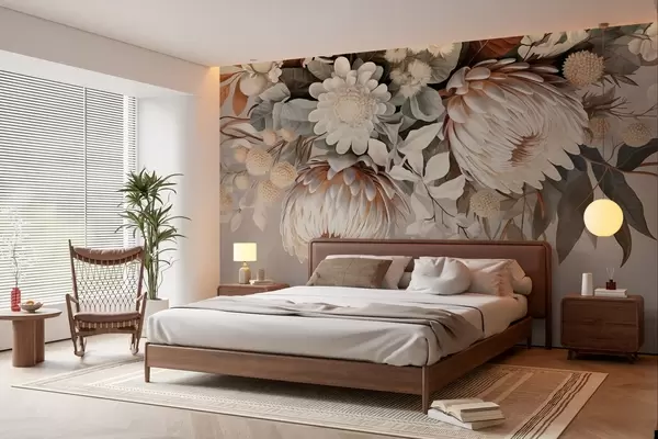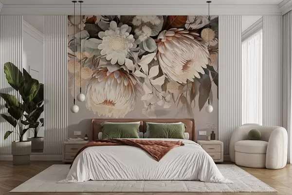 Фототапет Голяма текстурирана протея с кафяви акценти, бели маргаритки и жълти цветя, бежов приглушен фон Nr w09157
