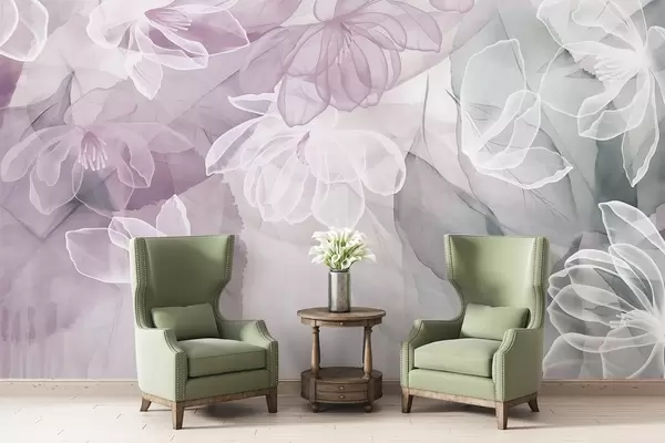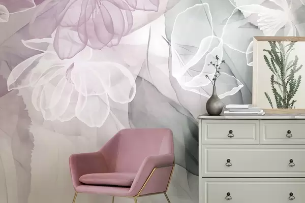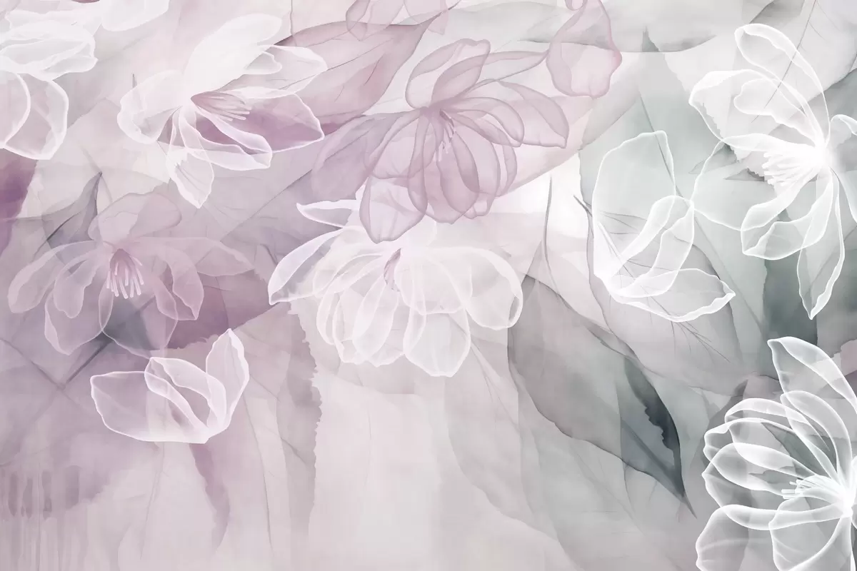 Фототапет Цветя и листа с прозрачни венчелистчета в нюанси на бяло, розово и зелено, меки и деликатни Nr w09158v1