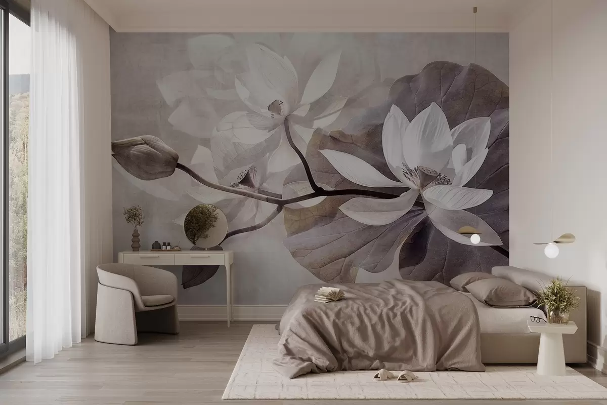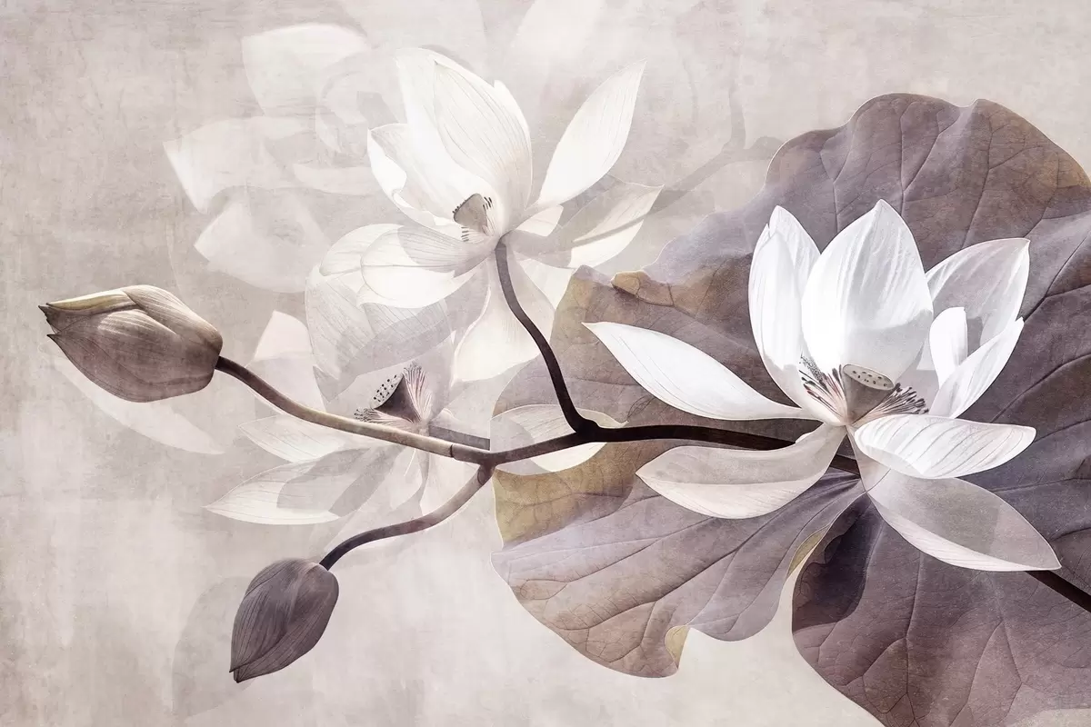 Фототапет Зърнеста текстура с приглушени деликатни лотосови цветя с листа и стъбла в мека, бежова цветова палитра Nr w09159
