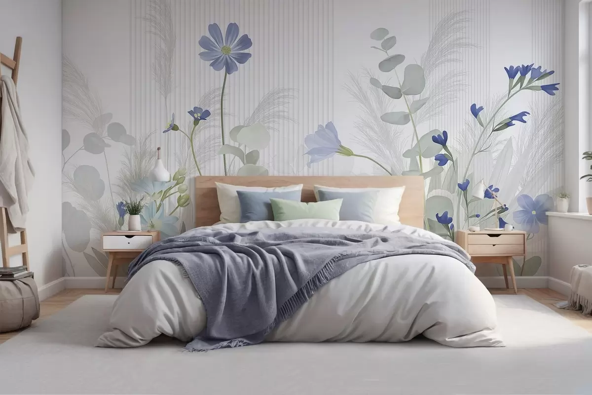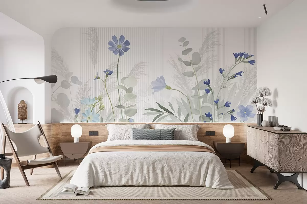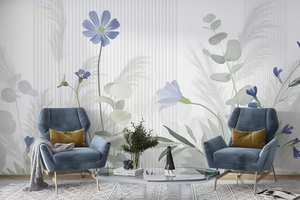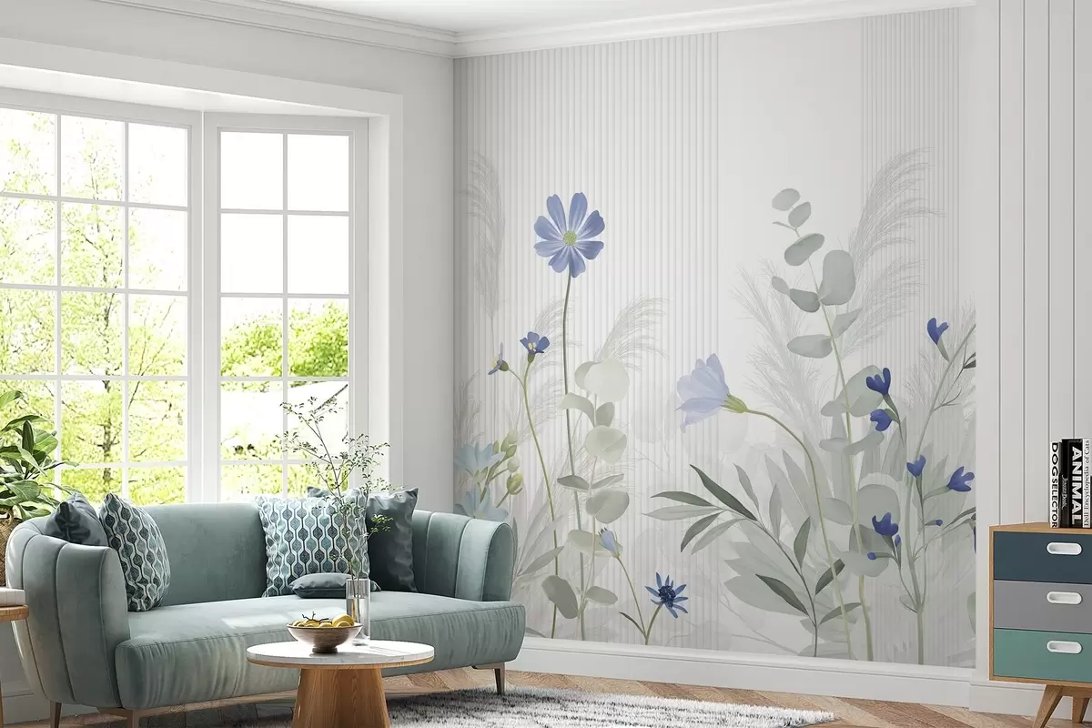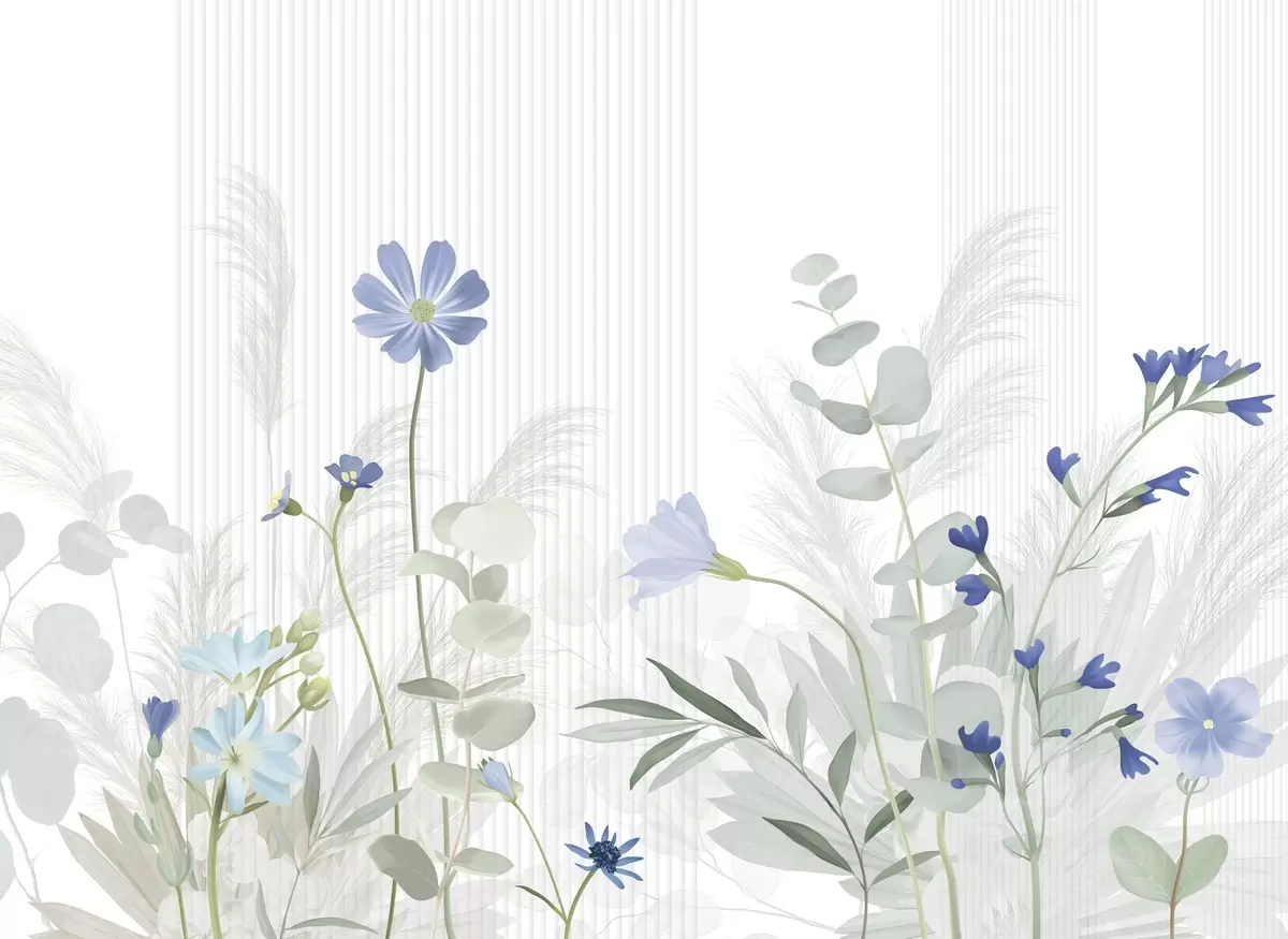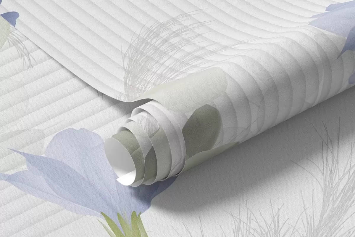 Фототапет Цветя в пастелни цветове, светлозелени листа, бял фон с вертикални линии, елегантен и минималистичен Nr w09161v1