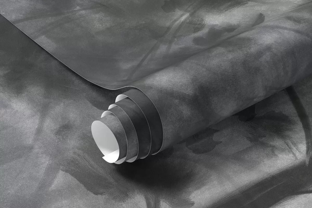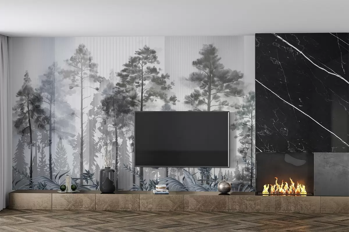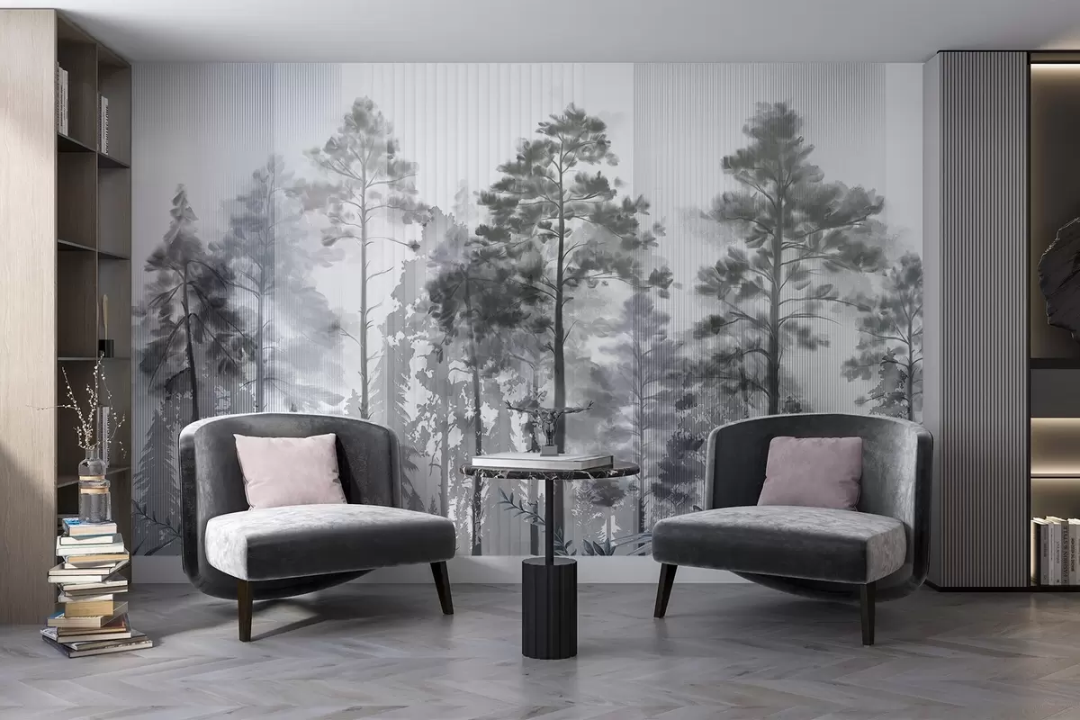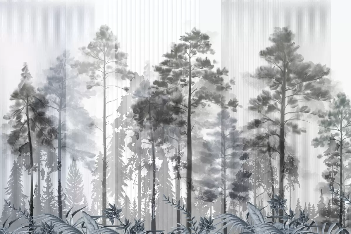 Фототапет Гъста гора с високи борови дървета, буйна сива зеленина, мъглива атмосфера с текстури на вертикални линии Nr w09163v2