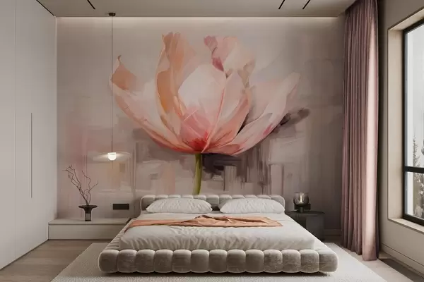 Фототапет Розово лале, имитация на живопис с маслени бои с меки движения на четката, абстрактен фон с пастелни нюанси на сиво и бежово Nr w09187