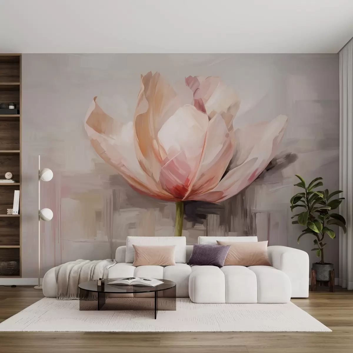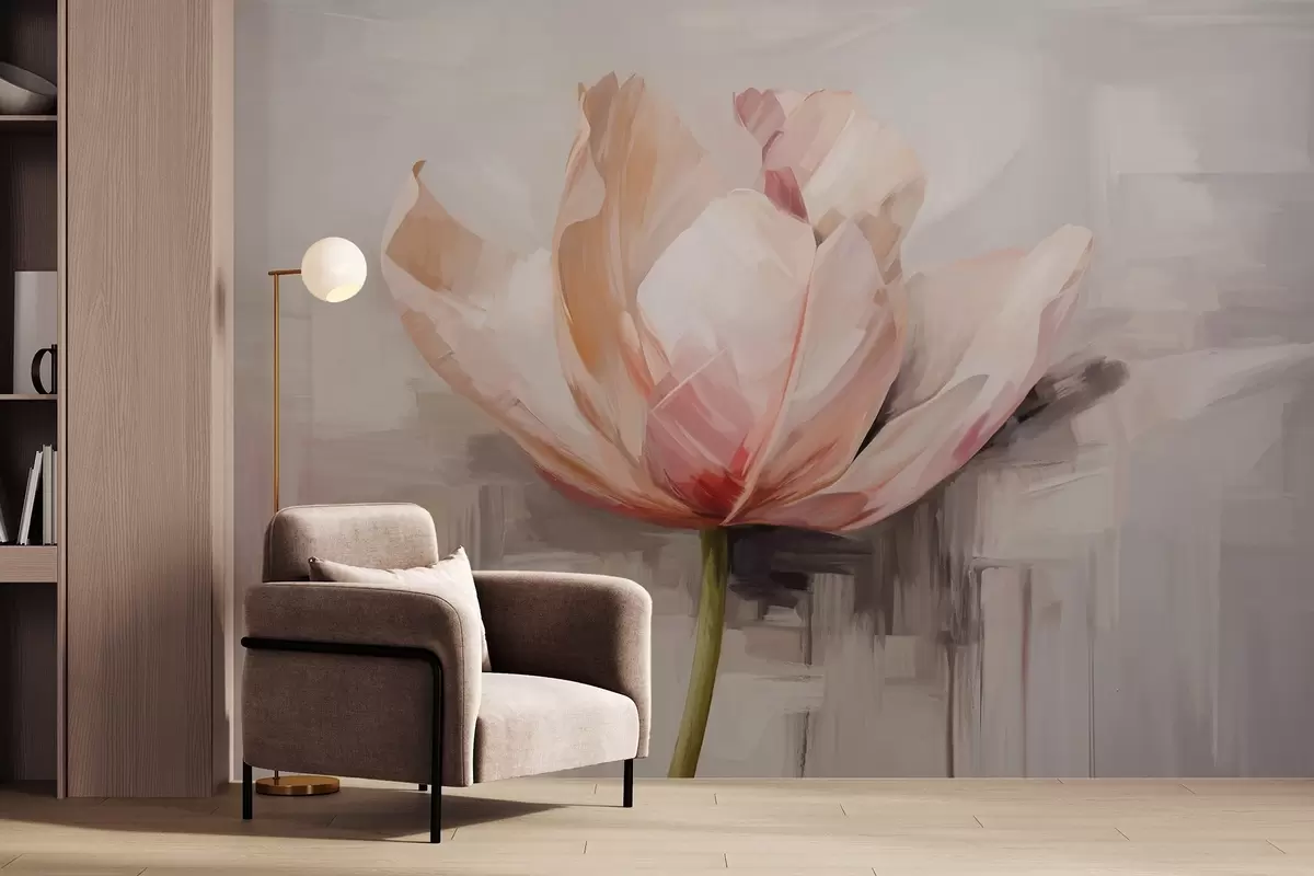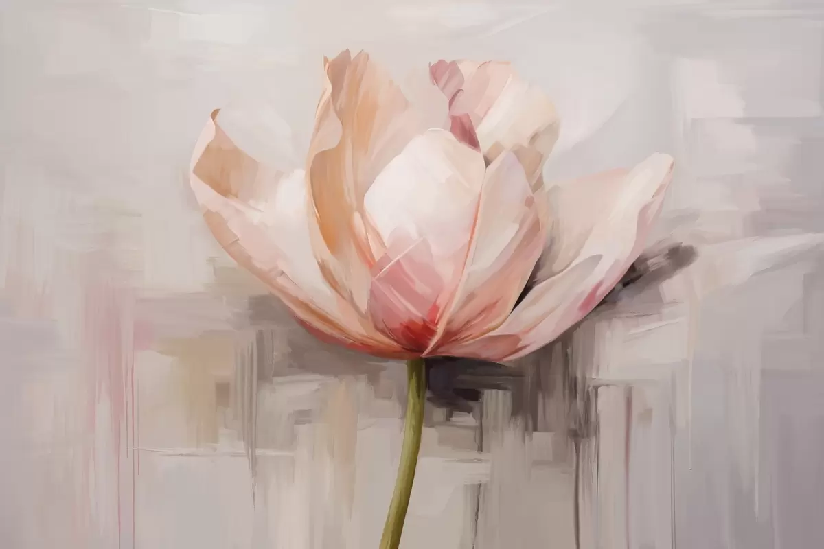 Фототапет Розово лале, имитация на живопис с маслени бои с меки движения на четката, абстрактен фон с пастелни нюанси на сиво и бежово Nr w09187