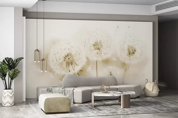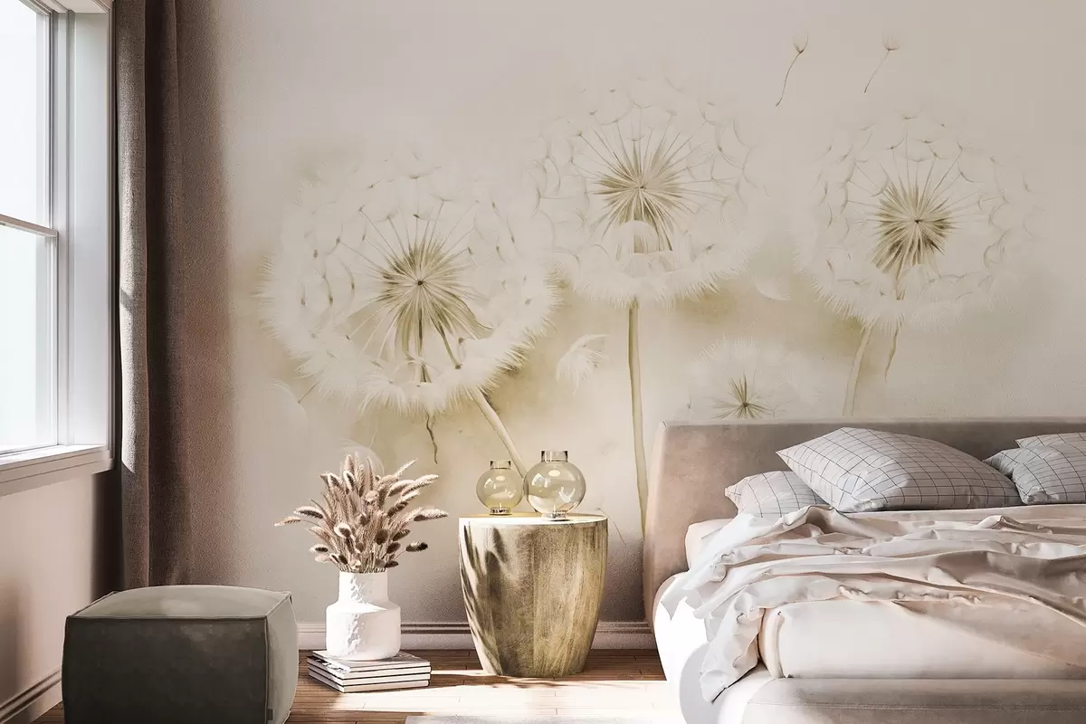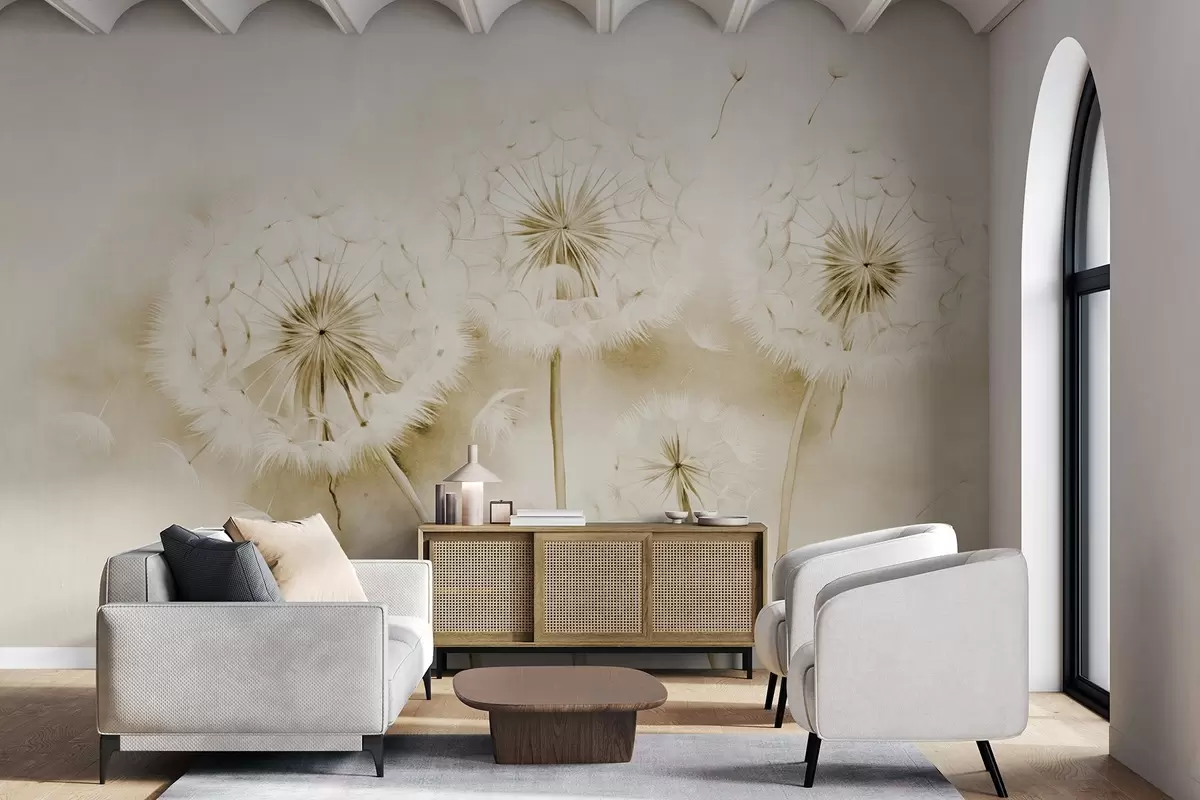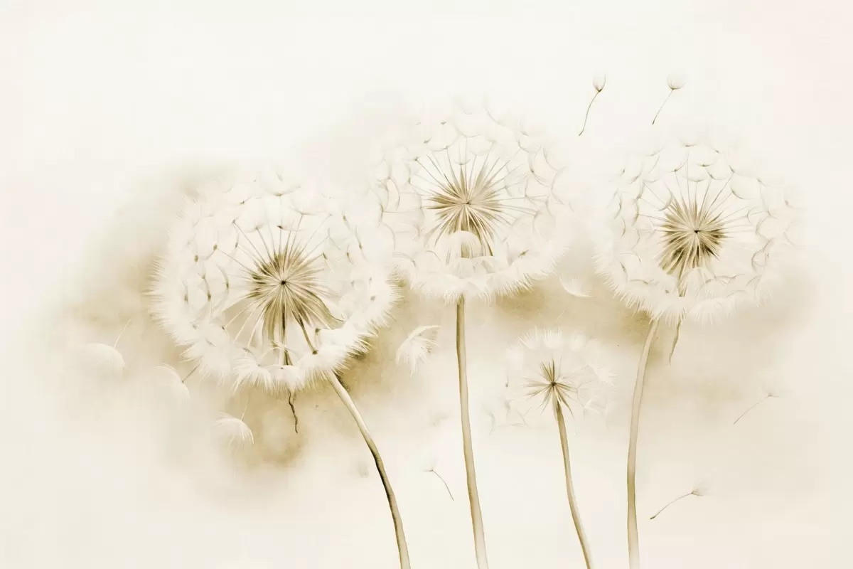 Фототапет Текстурирани глухарчета със семена, носещи се във въздуха, приглушен жълт и бял фон, мек деликатен стил на рисуване Nr w09190v1