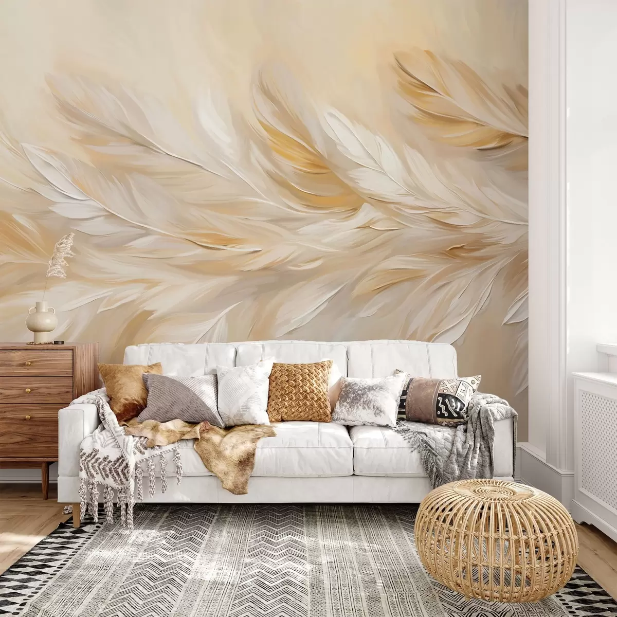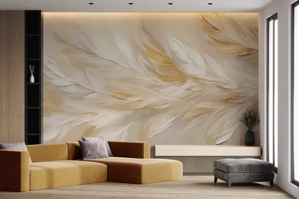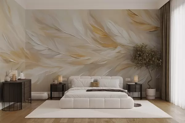Фототапет Бели и бежови пера, подредени в плавен принт, мека текстура, топла цветова палитра, абстрактен фон Nr w09191