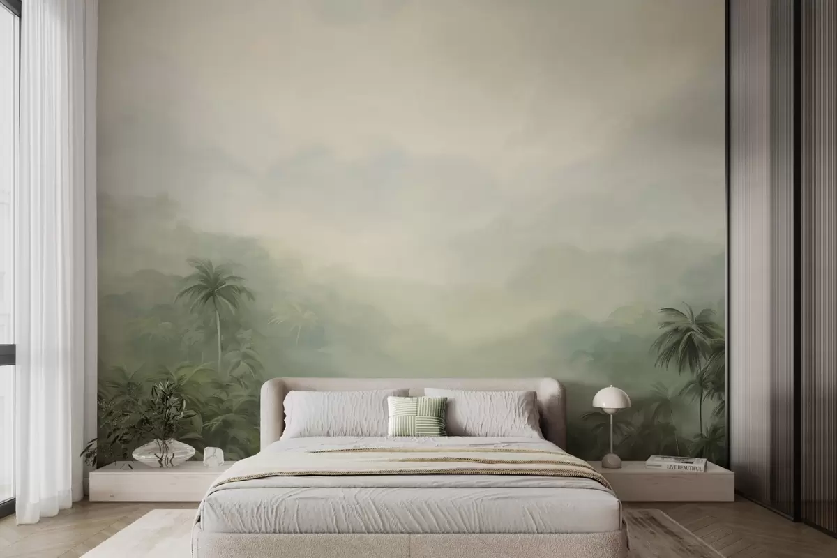 Фототапет Пейзаж от Гунгле с буйни зелени палми и хълмове , меки пастелни цветове, текстурирана имитация на живопис Nr w09194
