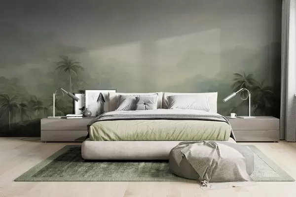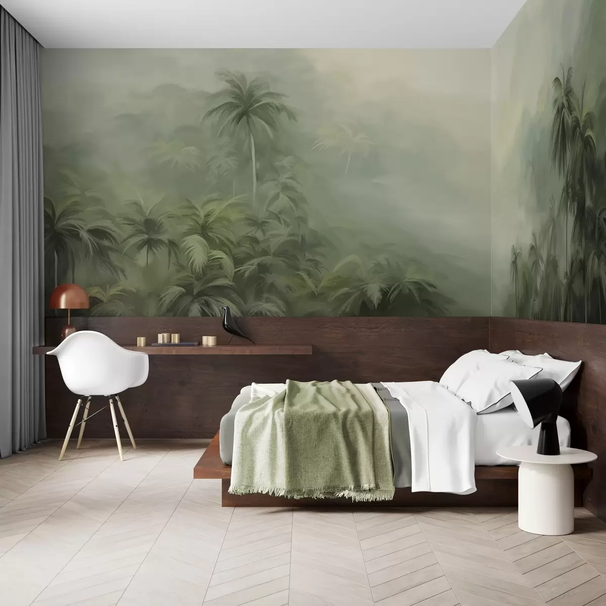 Фототапет Пейзаж от Гунгле с буйни зелени палми и хълмове , меки пастелни цветове, текстурирана имитация на живопис Nr w09194