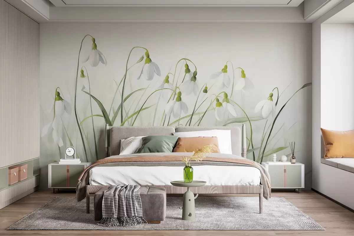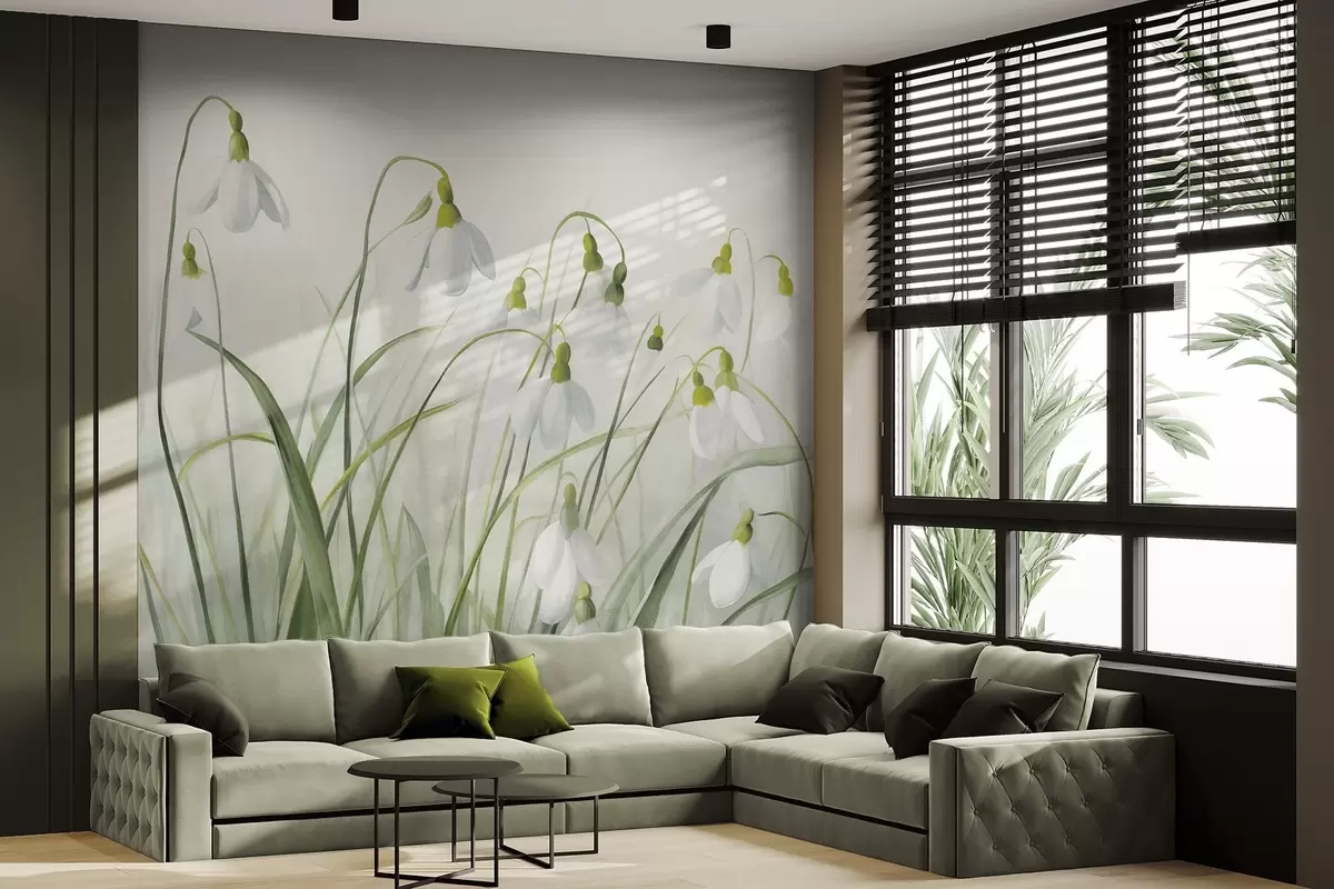 Фототапет Цветя от снежинки със зелени текстурирани стъбла и листа, акварел в пролетен стил, деликатни движения на четката Nr w09195