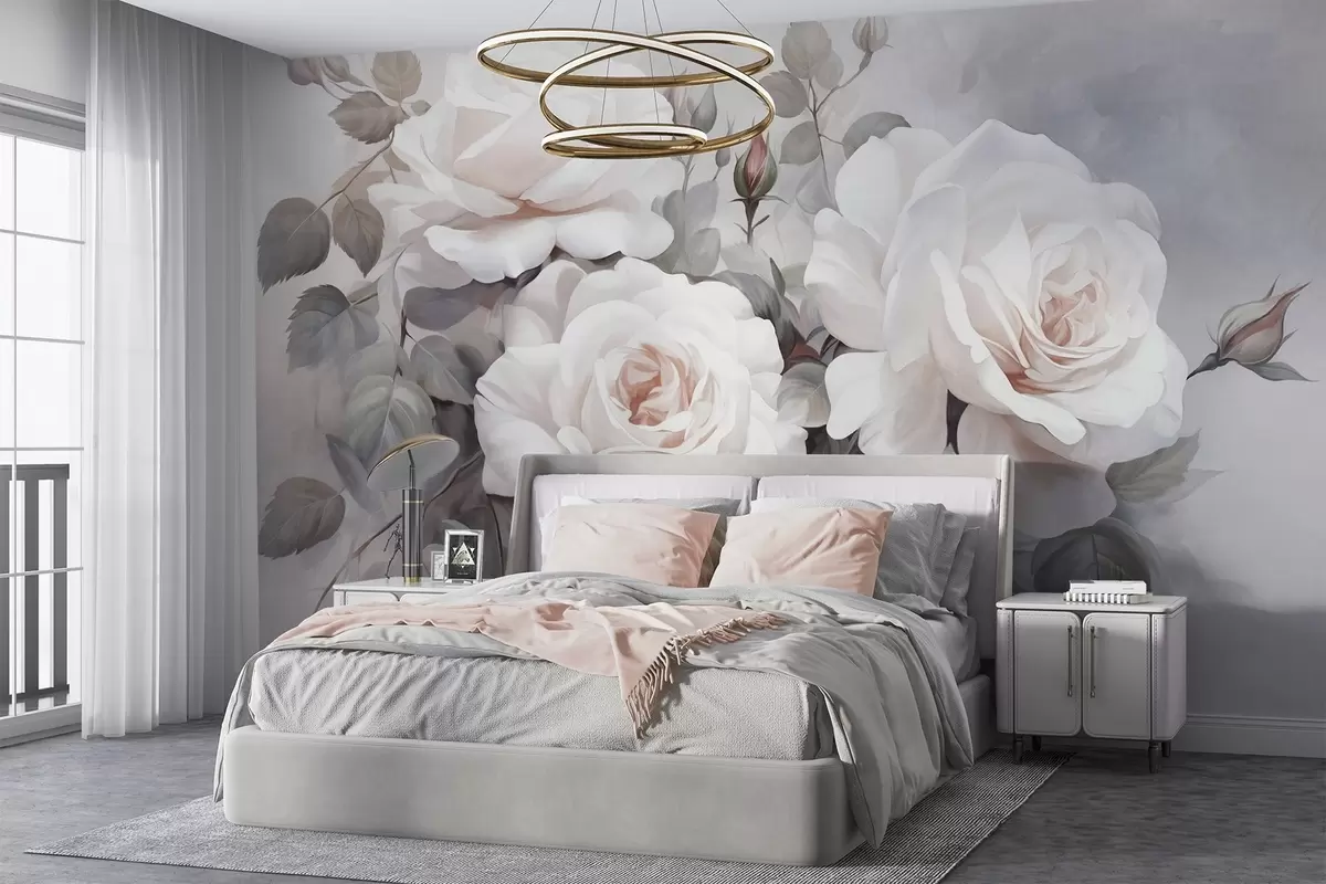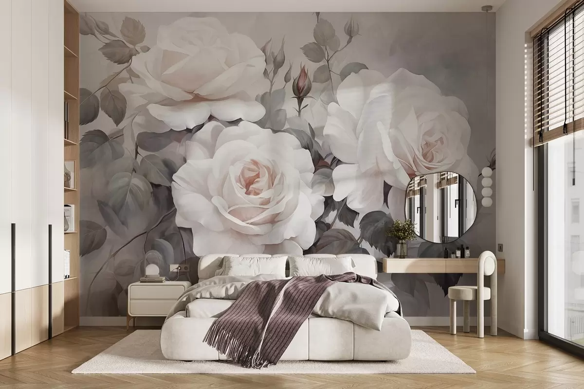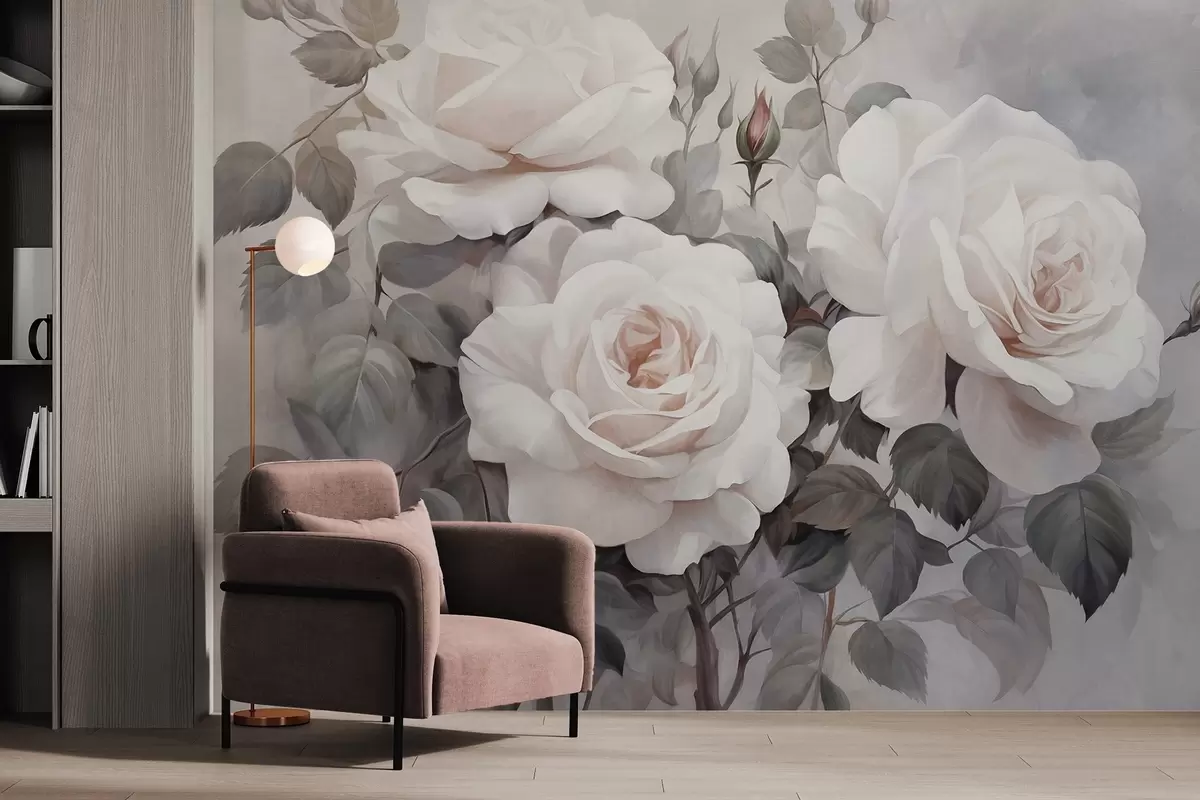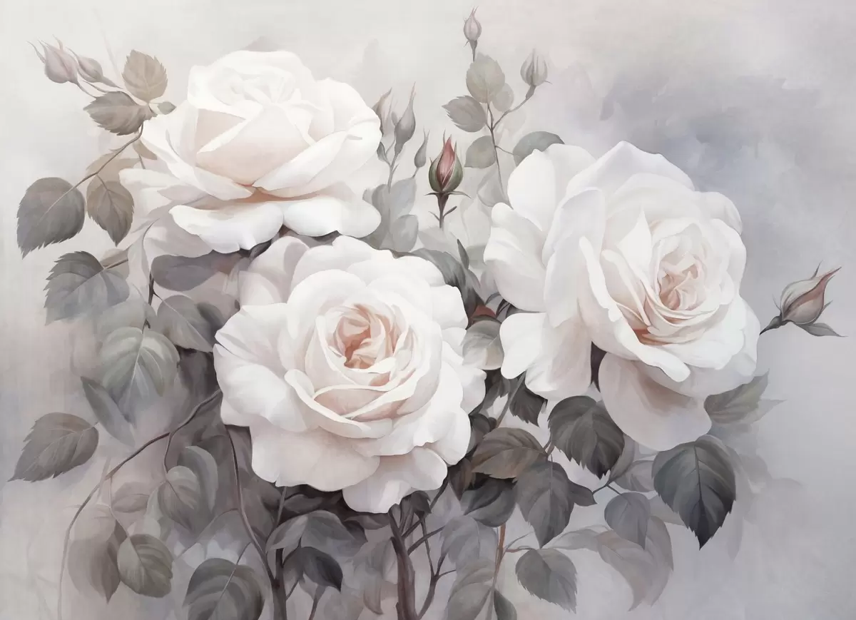 Фототапет Текстурирани бели рози с листа и стъбла, меки приглушени пастелни цветове, елегантен винтидж стил , деликатни движения на четката Nr w09198