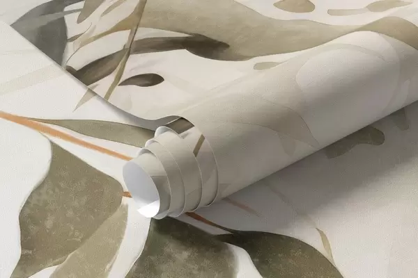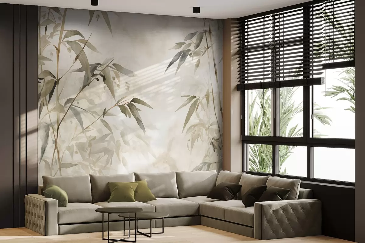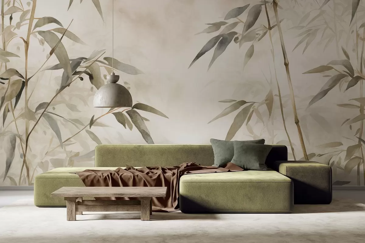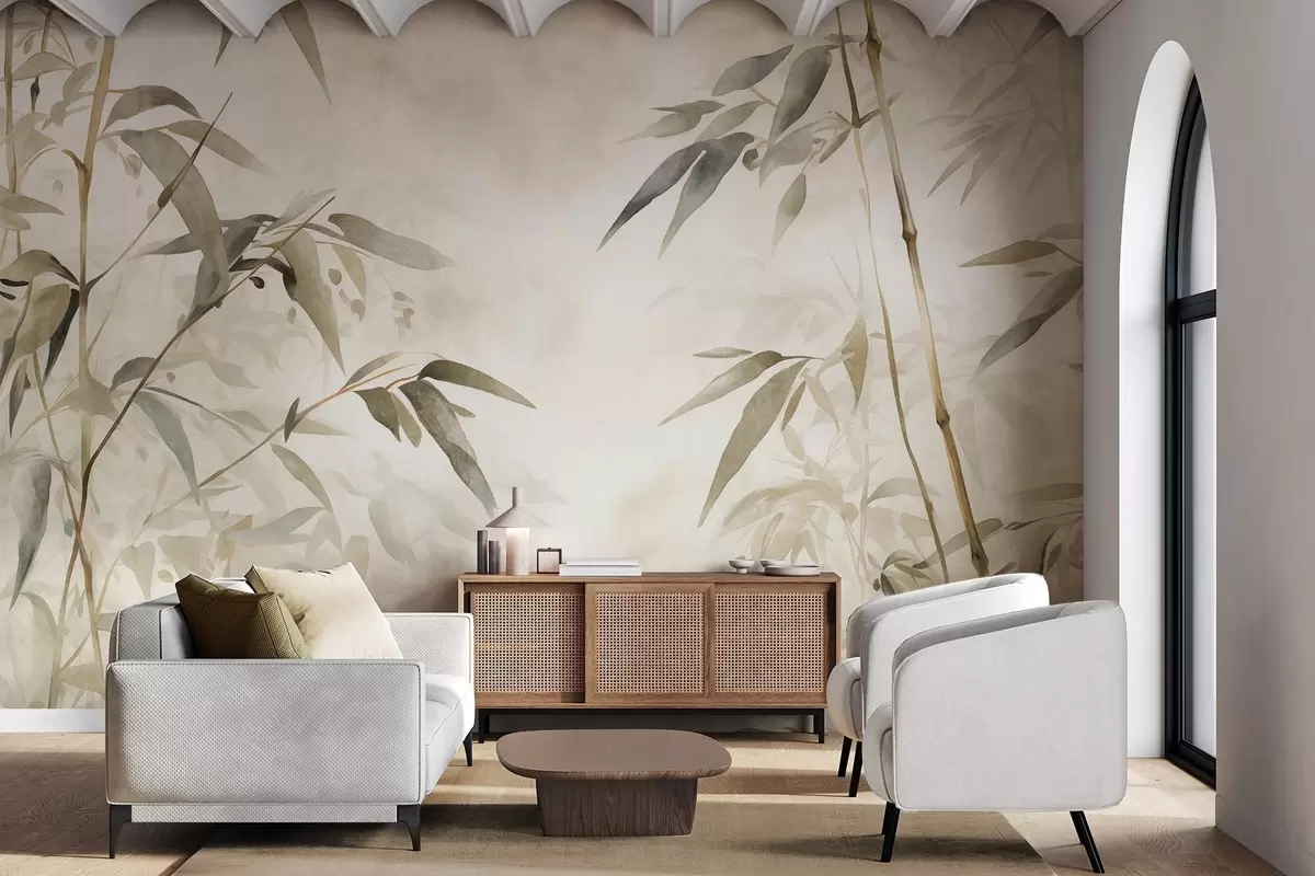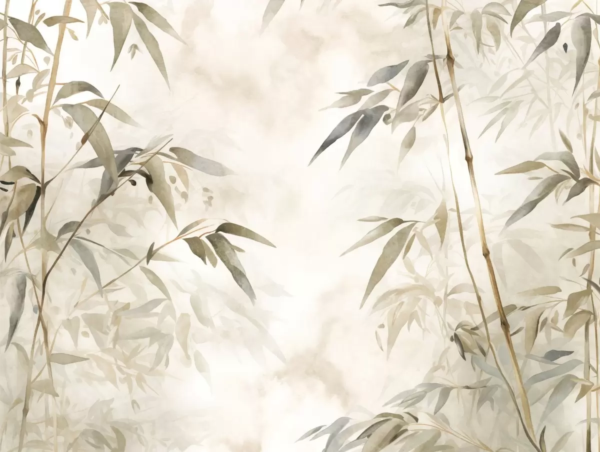Фототапет Бамбукови клони с текстура и листа в акварелен стил, мека неутрална цветова палитра, светлобежов фон Nr w09204