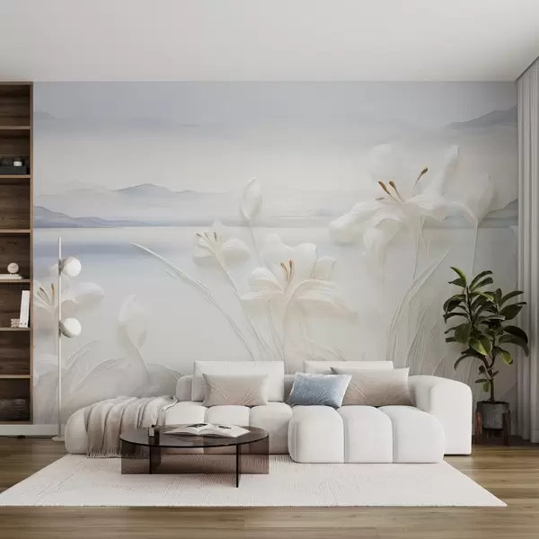 Фототапет Бели лилии с дълги стъбла и листа, планини и езеро на заден план, минималистична пейзажна композиция Nr w09206