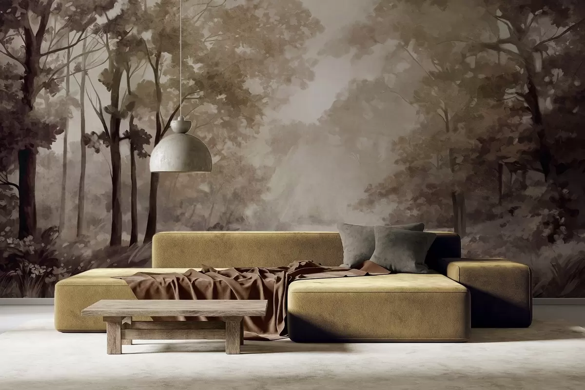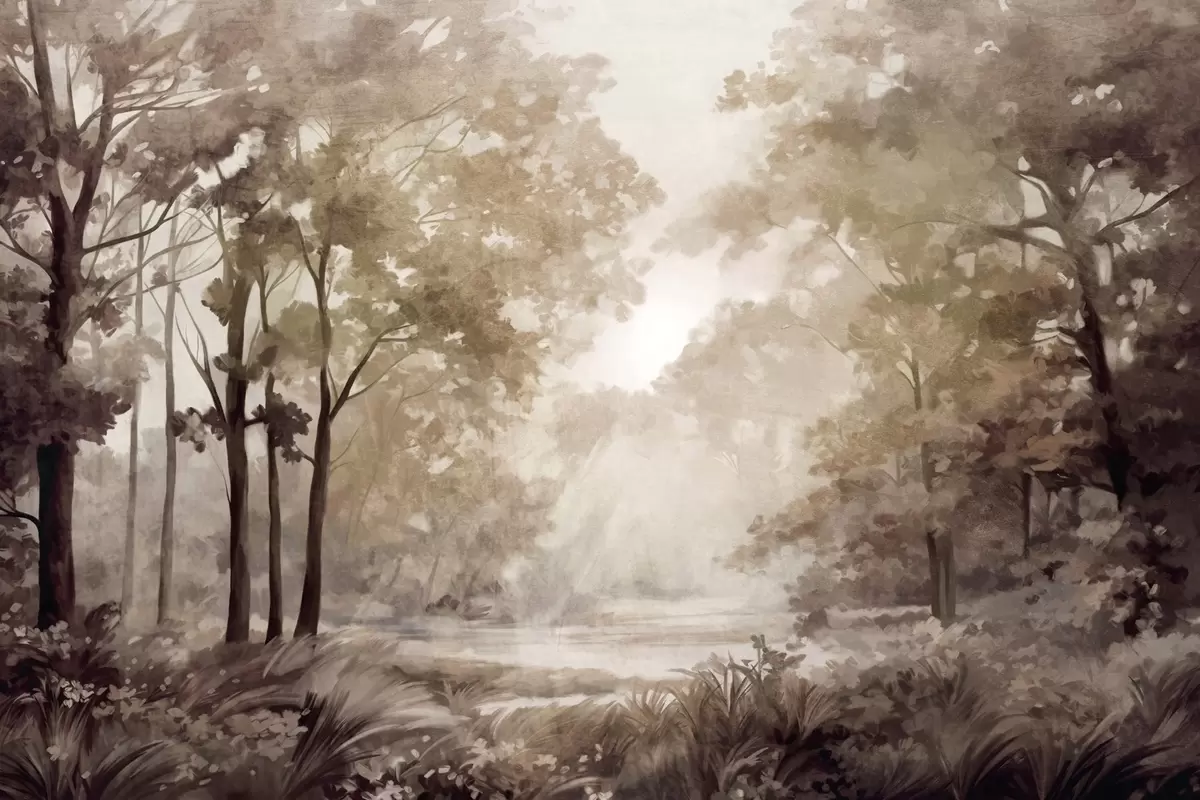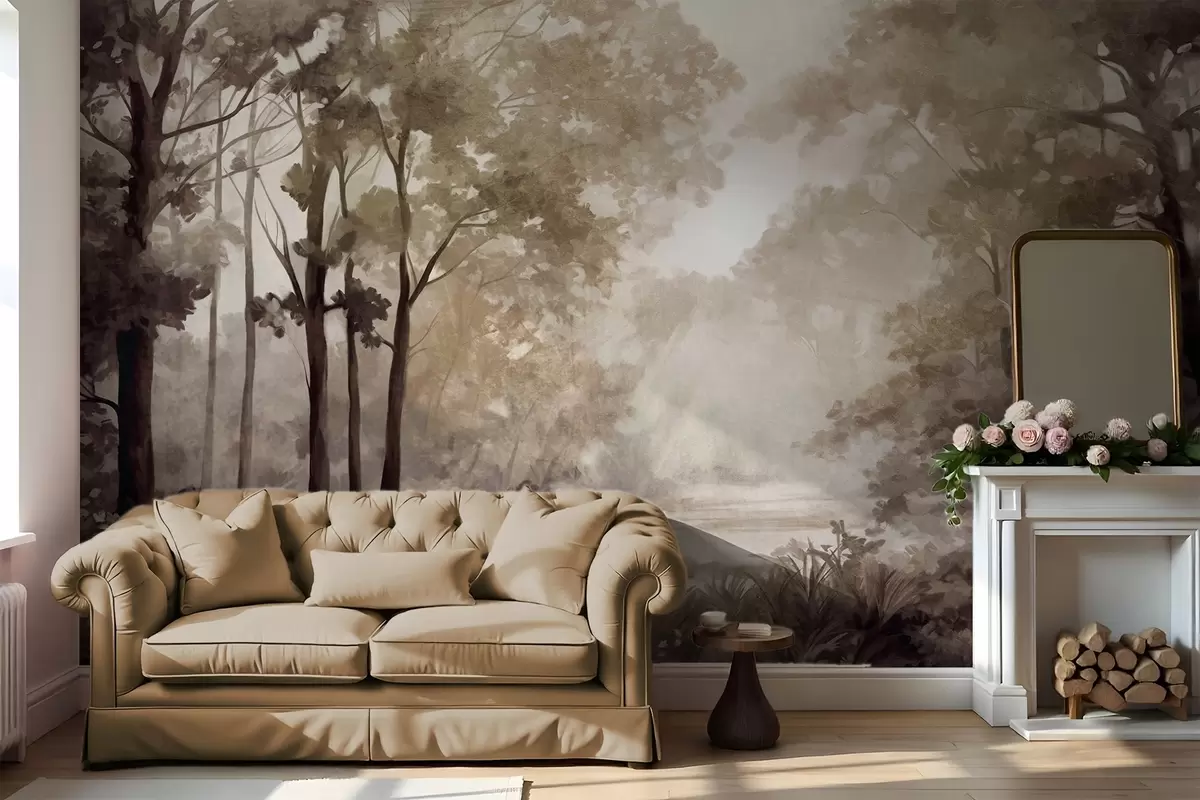 Фототапет Текстуриран горски пейзаж, дървета с бежови и кафяви листа, пастелна цветова палитра Nr w09210