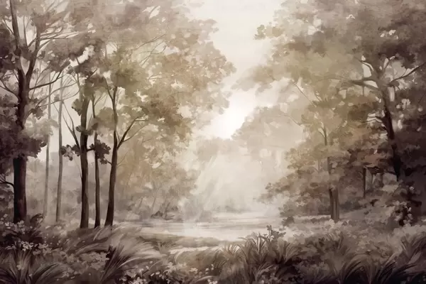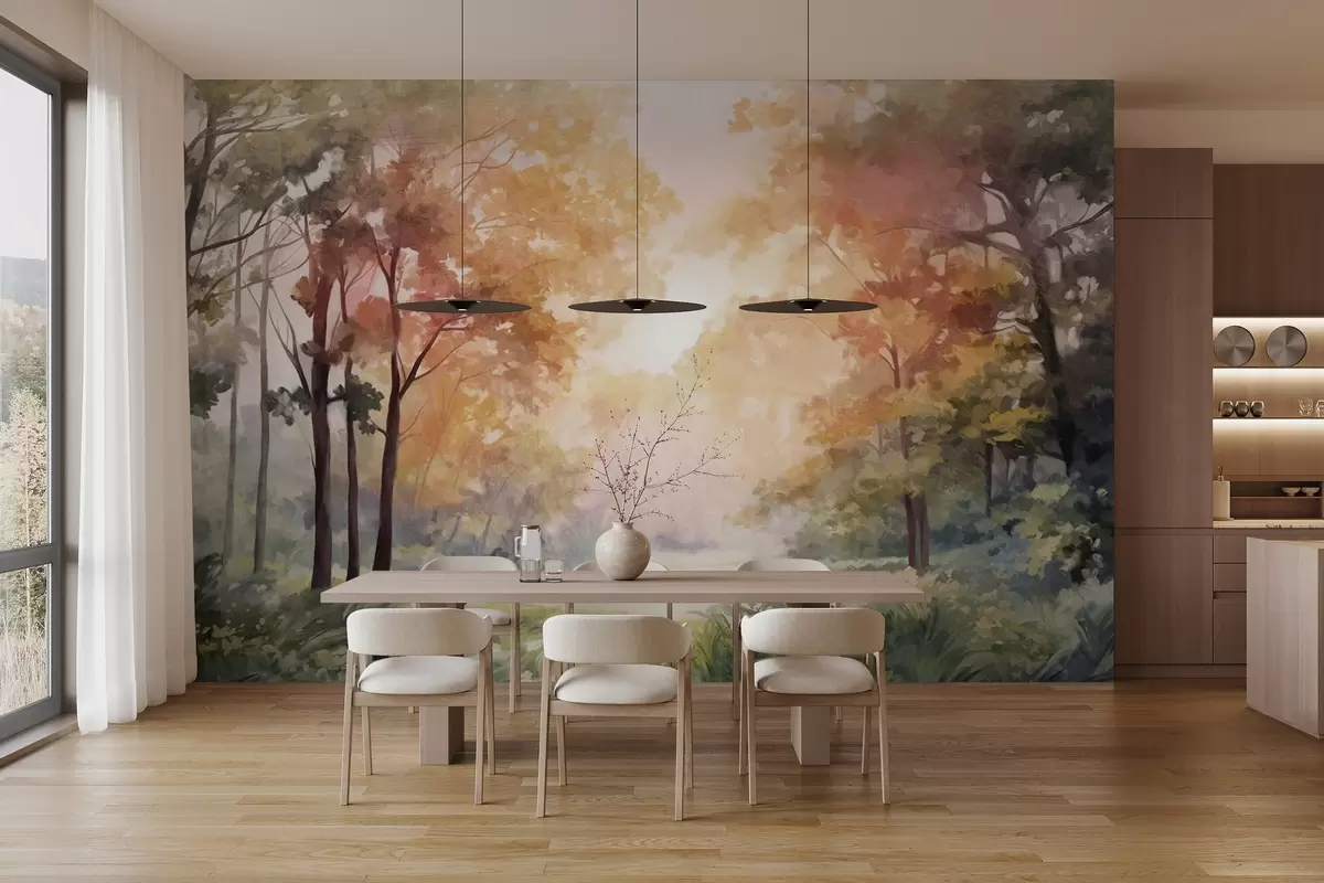 Фототапет Текстуриран горски пейзаж, дървета с оранжеви и зелени листа, пастелна цветова палитра Nr w09210v1