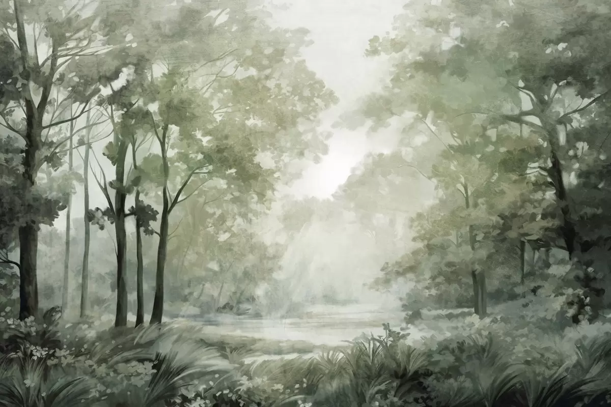 Фототапет Текстуриран горски пейзаж, дървета със зелени листа, пастелна цветова палитра Nr w09210v2