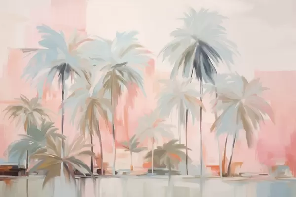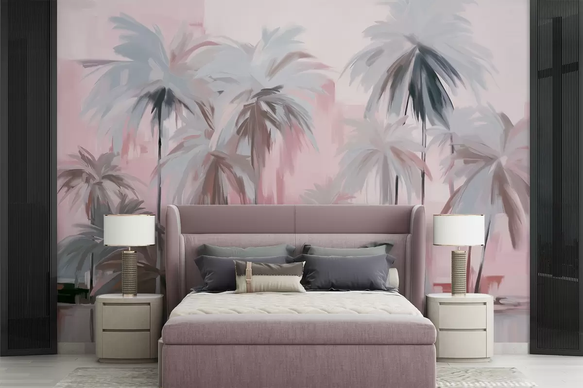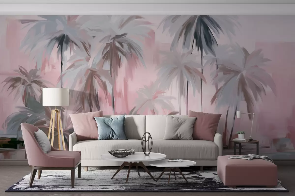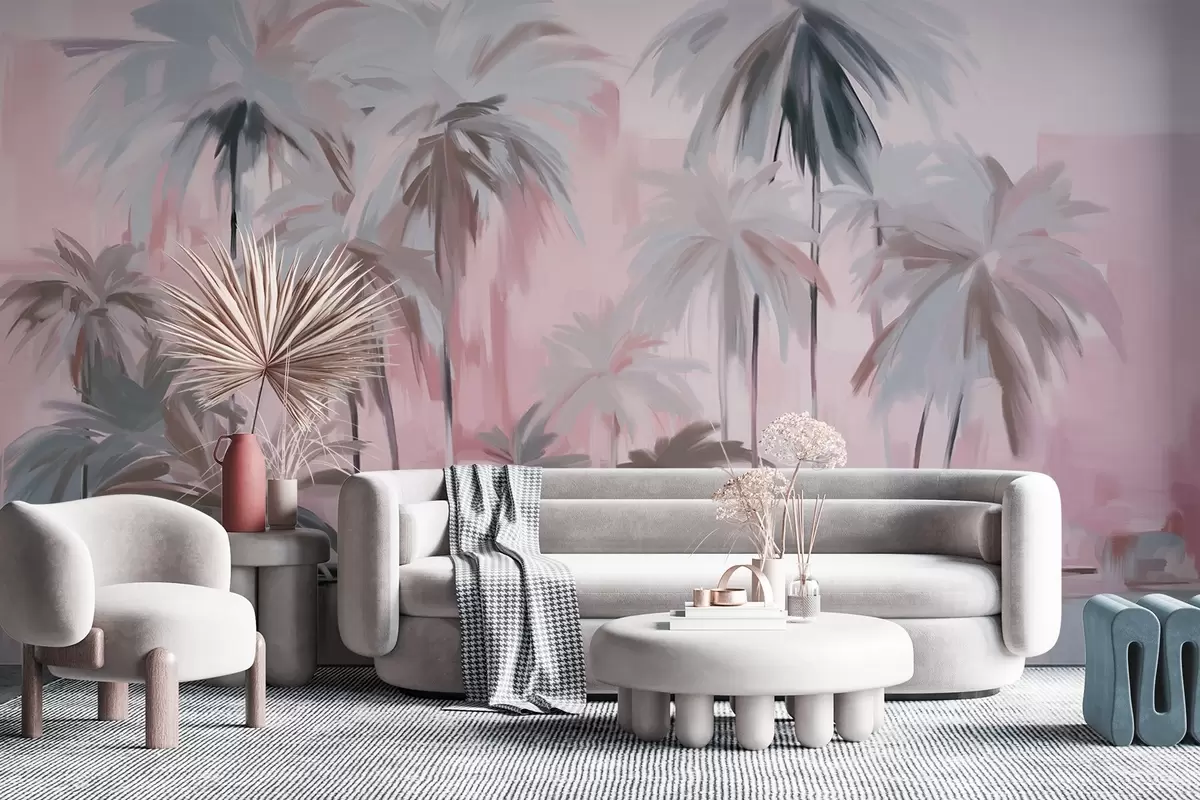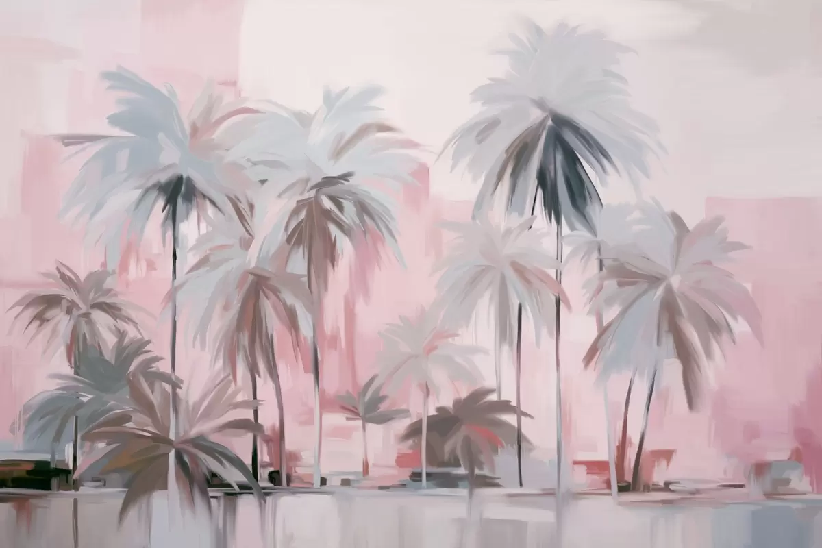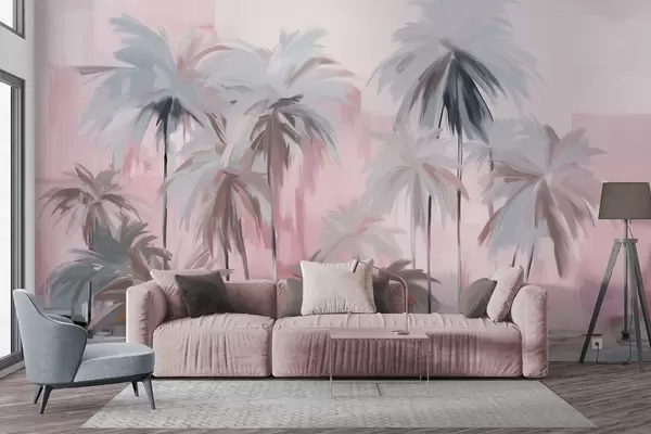 Фототапет Абстрактни минималистични пастелни тропически палми на фона на приглушени розови и сиви нюанси Nr w09212v1