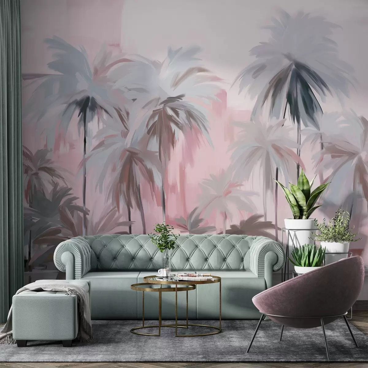 Фототапет Абстрактни минималистични пастелни тропически палми на фона на приглушени розови и сиви нюанси Nr w09212v1