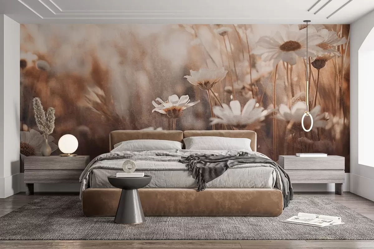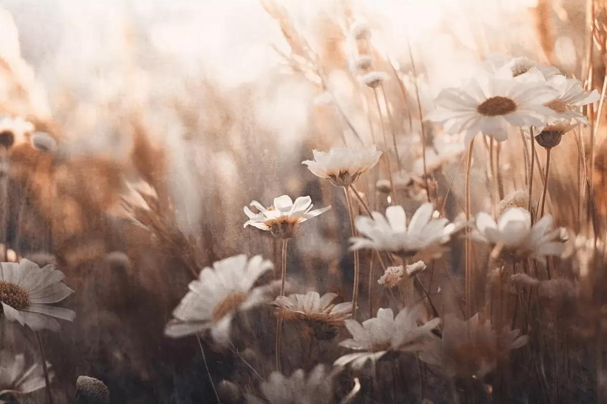 Фототапет Текстурирано поле от бели маргаритки и диви цветя в топла цветова палитра с размазан фон Nr w09214