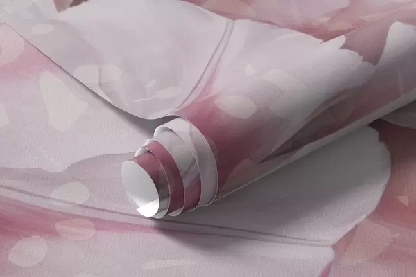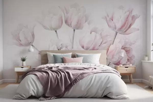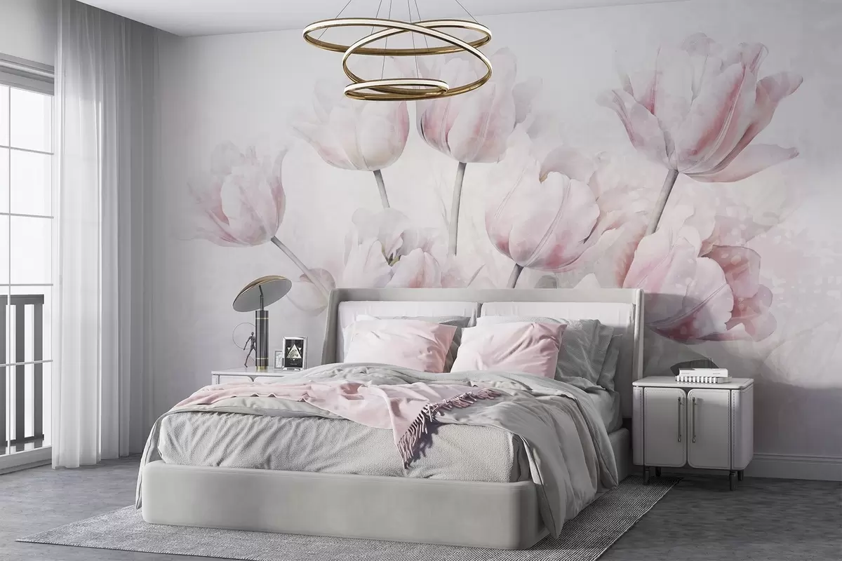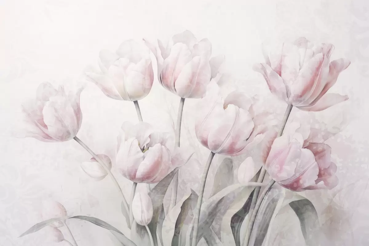 Фототапет Розови текстурирани лалета със зелени листа, мека светлина, винтидж акварелен стил, деликатни движения на четката Nr w09220