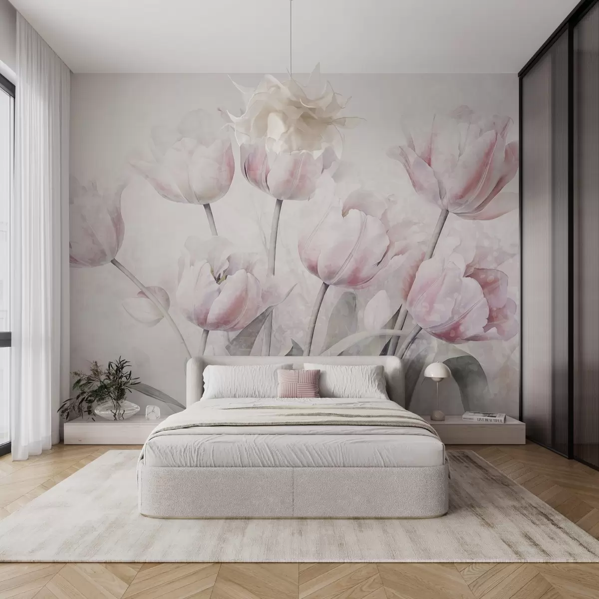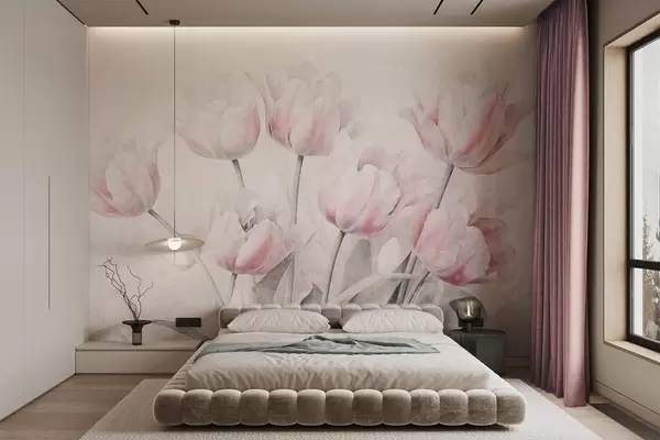 Фототапет Розови текстурирани лалета със зелени листа, мека светлина, винтидж акварелен стил, деликатни движения на четката Nr w09220
