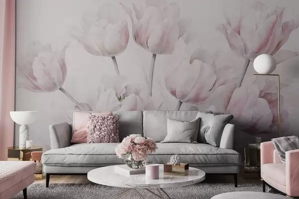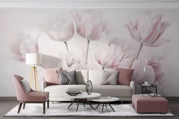 Фототапет Розови текстурирани лалета със зелени листа, мека светлина, винтидж акварелен стил, деликатни движения на четката Nr w09220