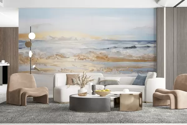 Фототапет Абстрактен текстуриран пейзаж океански вълни, разбиващи се на пясъчен плаж, меки пастелни цветове, синьо небе с леки облаци Nr w09234