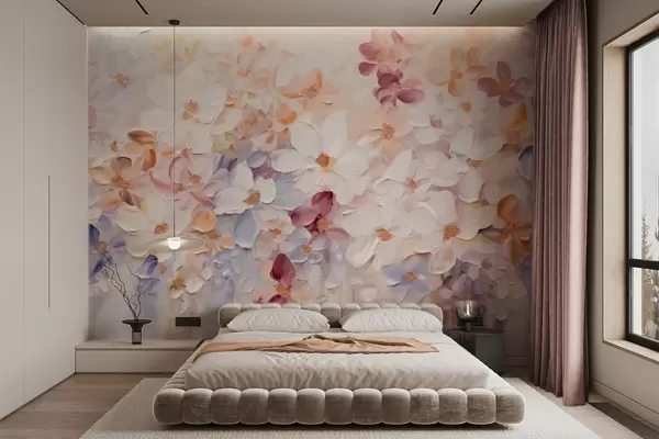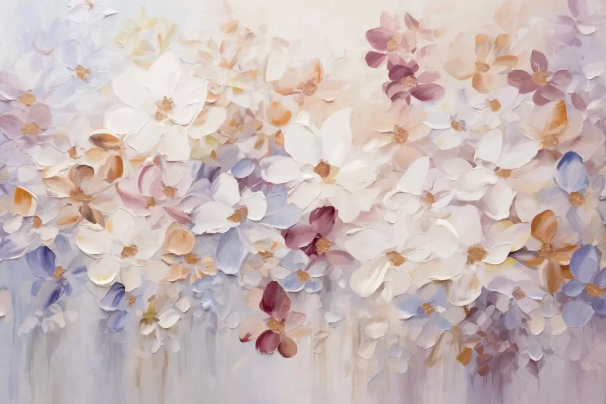 Фототапет Картина с маслени бои, имитация на цветна градина с бели, розови и оранжеви цветя, меки движения на четката, пастелни приглушени цветове Nr w09236