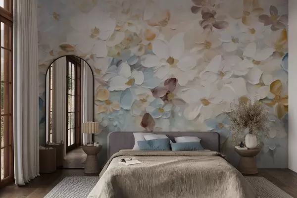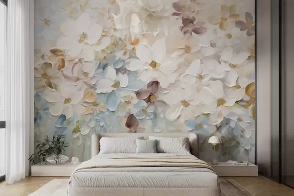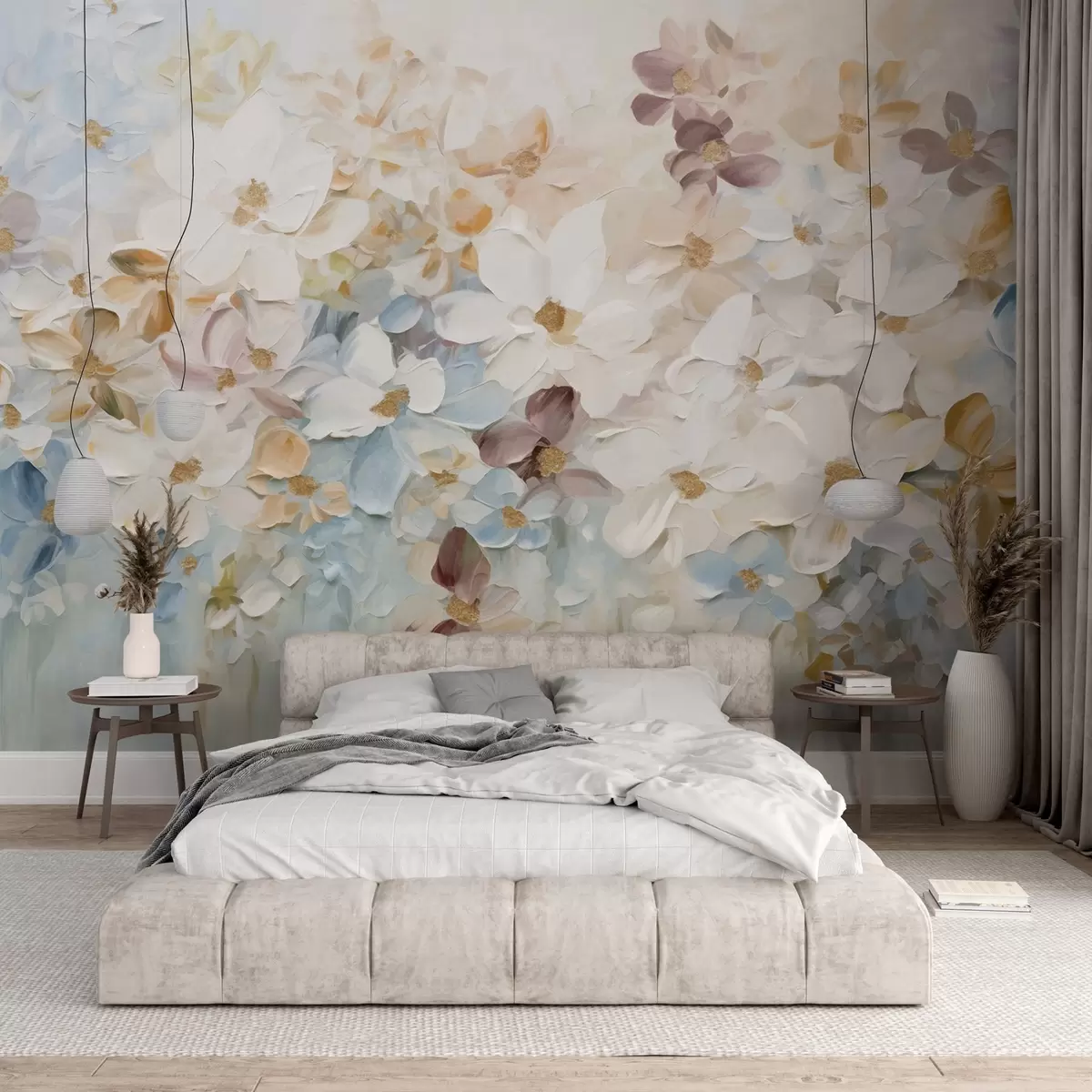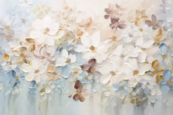 Фототапет Картина с маслени бои, имитация на цветна градина с бели, сини и оранжеви цветя, меки движения на четката, пастелни приглушени цветове Nr w09236v1