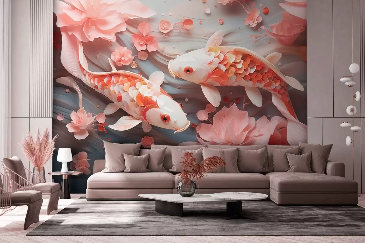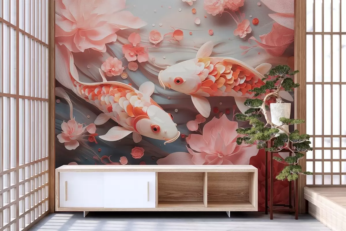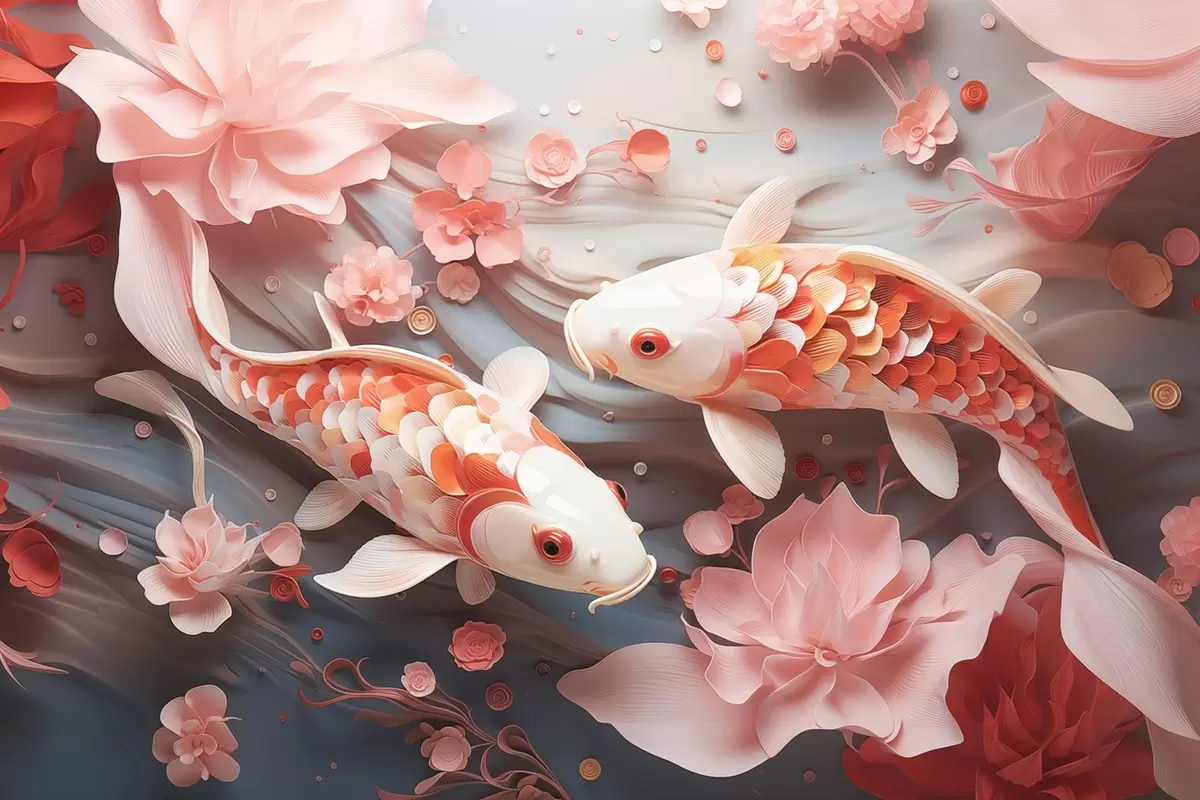Фототапет Деликатни рибки с обемни люспи плуват в поток от венчелистчета и меки розови тонове Nr w09237