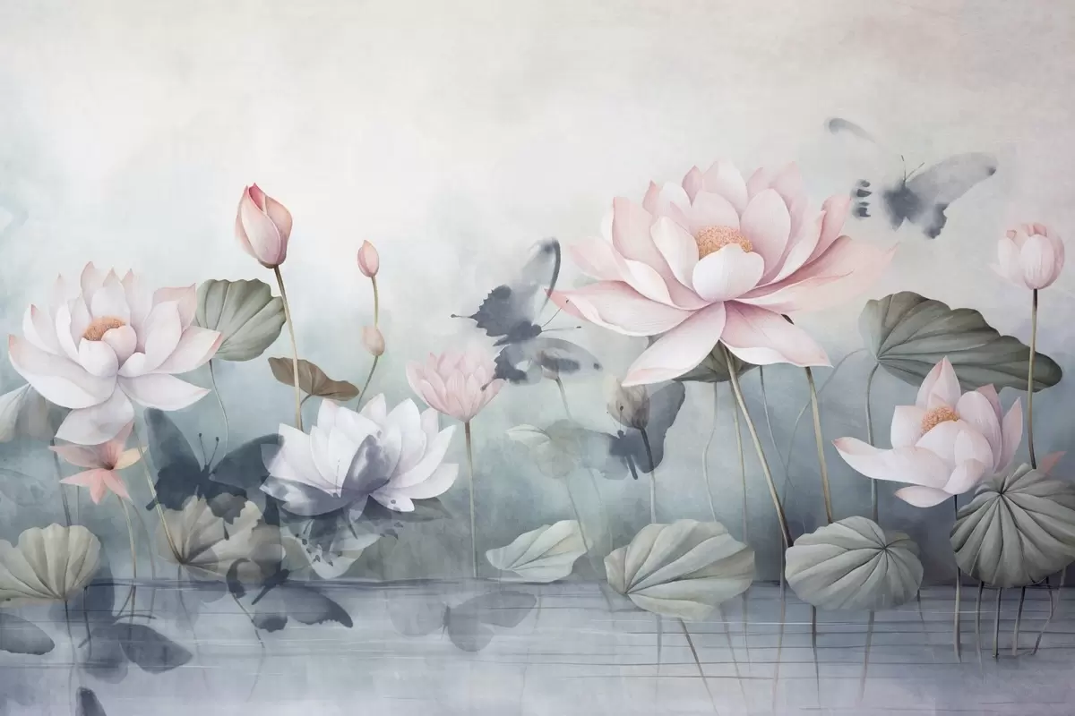 Фототапет Лотосови текстурирани цветя с розови пастелни венчелистчета, зелени листа, водно отражение, меки пастелни цветове , акварелен ефект Nr w09254