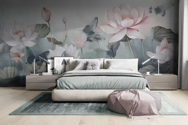 Фототапет Лотосови текстурирани цветя с розови пастелни венчелистчета, зелени листа, водно отражение, меки пастелни цветове , акварелен ефект Nr w09254