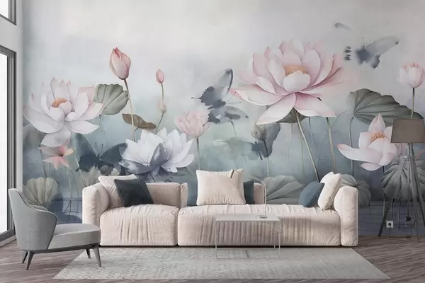 Фототапет Лотосови текстурирани цветя с розови пастелни венчелистчета, зелени листа, водно отражение, меки пастелни цветове , акварелен ефект Nr w09254