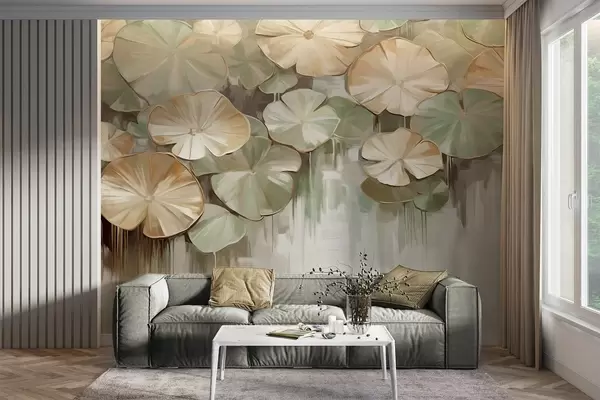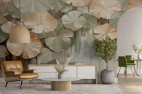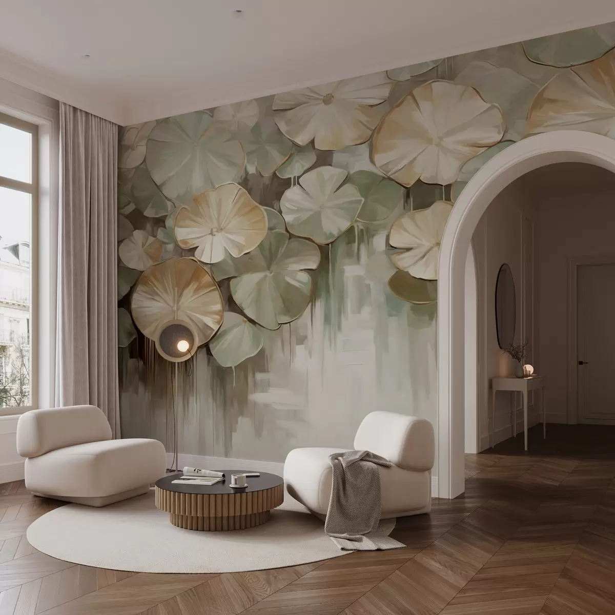 Фототапет Текстурирани лилии със зелени и бежови цветове в езеро, фонът е размазана смесица от бяло, зелено и кафяво Nr w09255