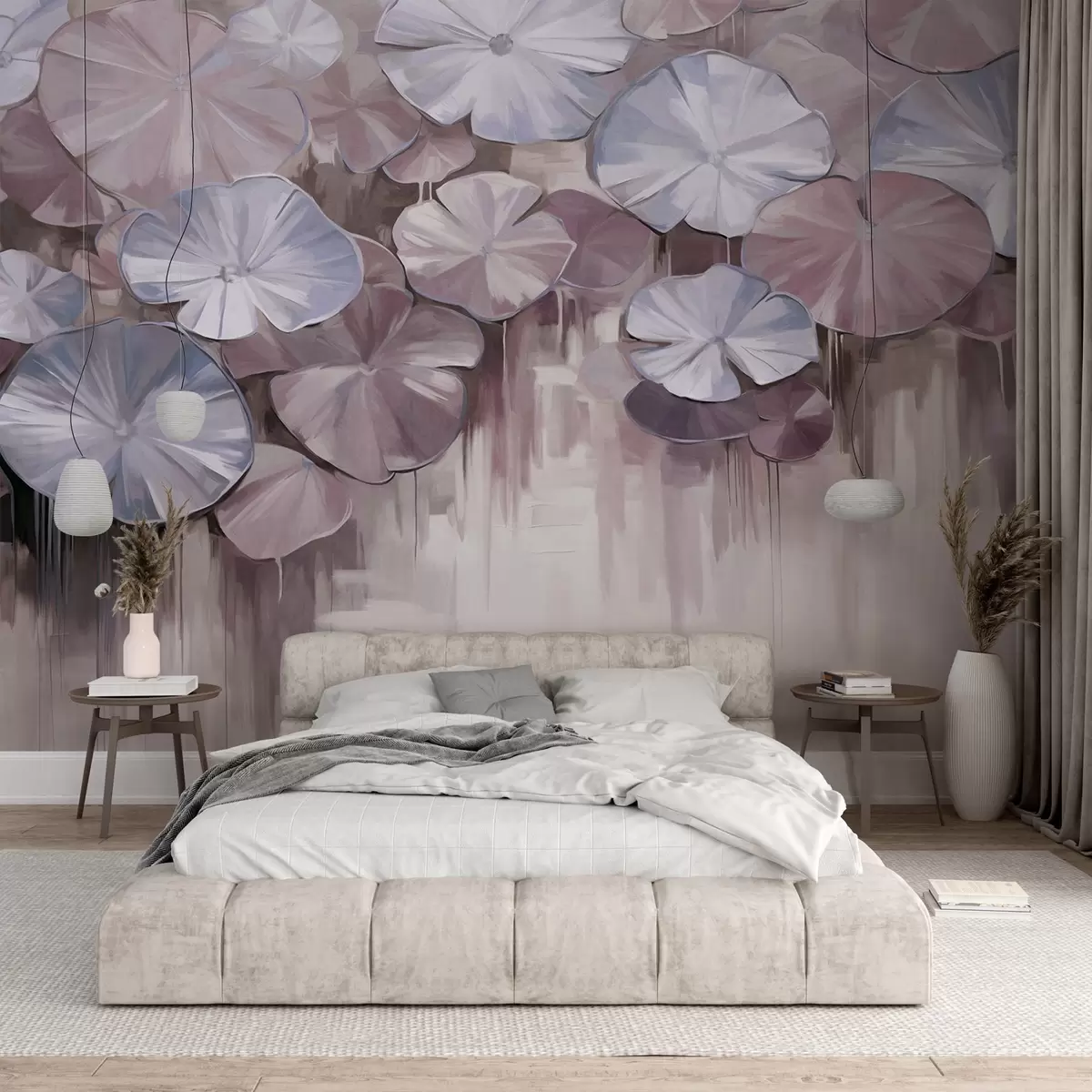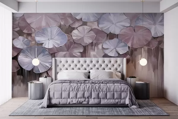 Фототапет Текстурирани лилии с виолетови и сини цветове в езеро, фонът е размазана смесица от меки нюанси на лилавото Nr w09255v1