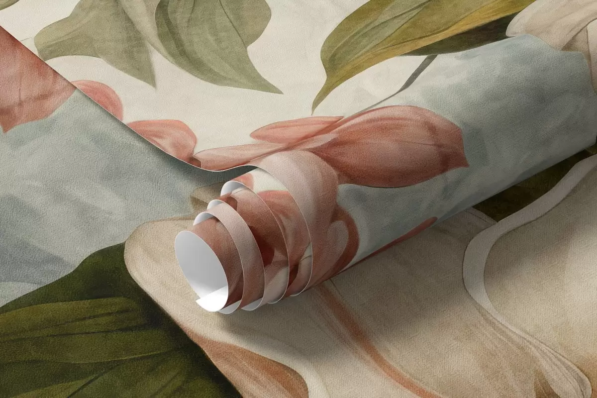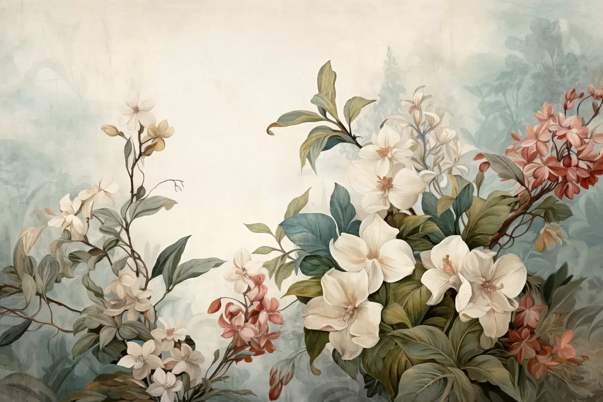 Фототапет Текстурирани тропически цветя и листа с меки сини и зелени нюанси, деликатни движения на четката, винтидж ботанически стил Nr w09259