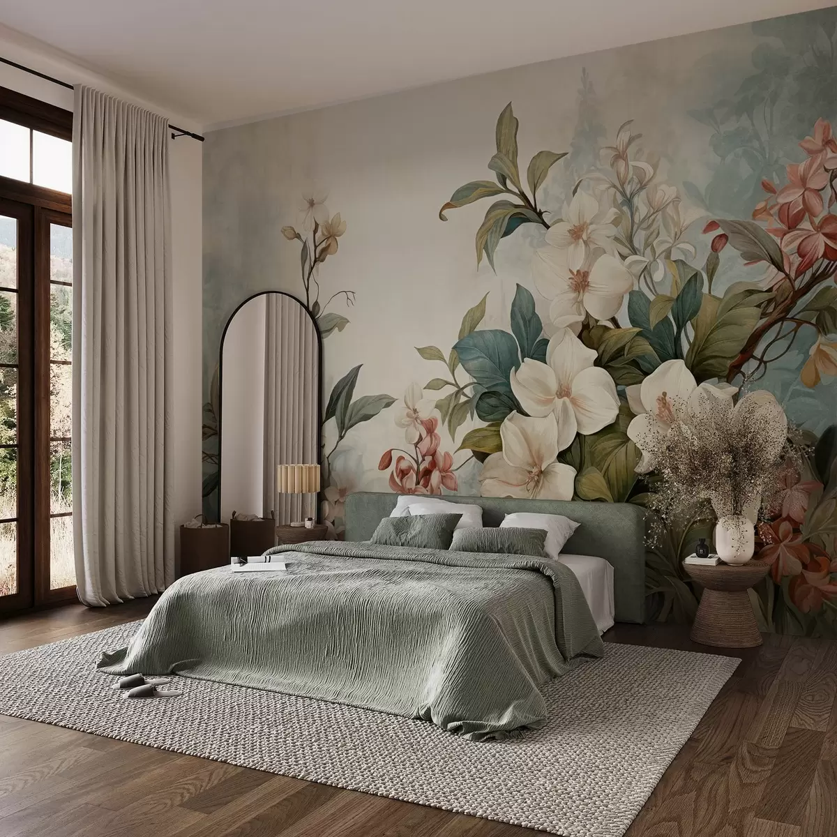 Фототапет Текстурирани тропически цветя и листа с меки сини и зелени нюанси, деликатни движения на четката, винтидж ботанически стил Nr w09259