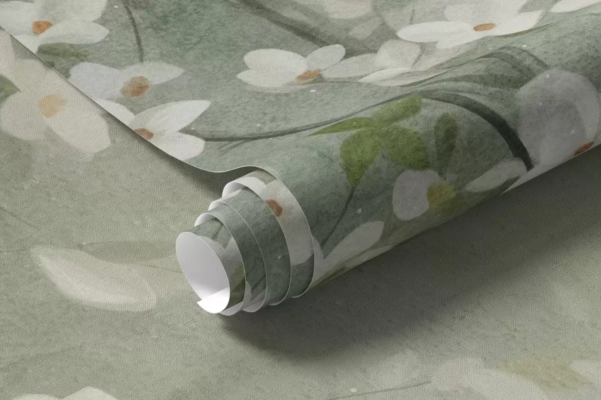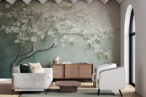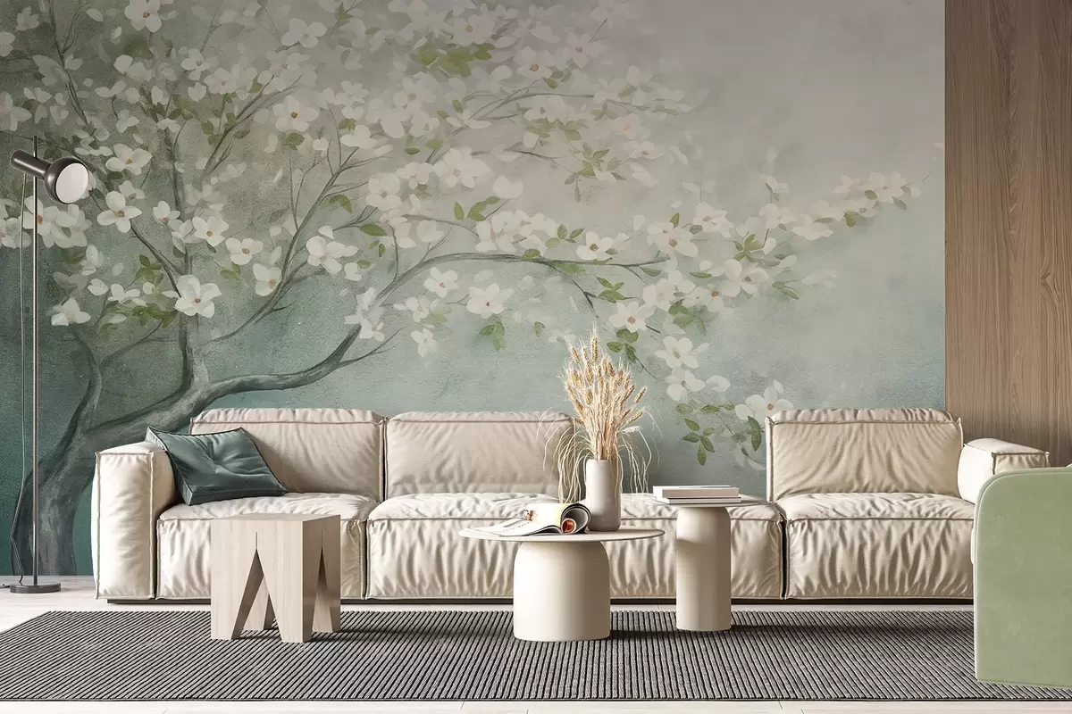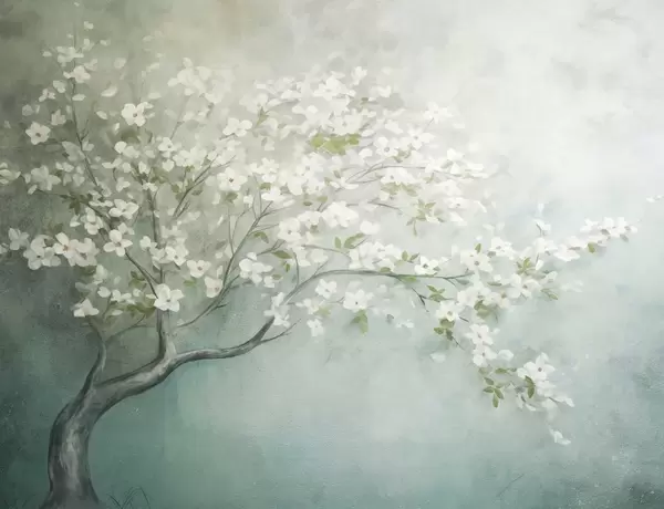 Фототапет Цъфтящо дърво с бели цветя в пълен разцвет на фона на зърнест шумно текстуриран фон в приглушено синьо и зелено Nr w09261
