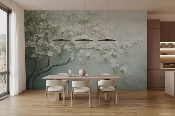 Фототапет Цъфтящо дърво с бели цветя в пълен разцвет на фона на зърнест шумно текстуриран фон в приглушено синьо и зелено Nr w09261