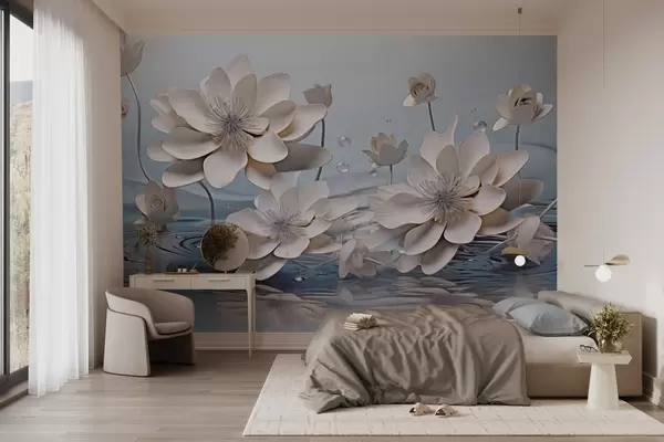 Фототапет Бели текстурирани цветя с водни капки, отражения върху водната повърхност, светлосин фон, елегантен дизайн Nr w09262