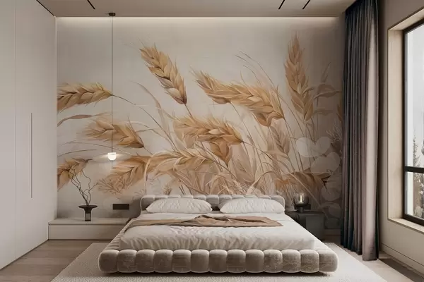 Фототапет Поле с пшенична текстура и бежови житни класове, поклащащи се от вятъра, меки и приглушени цветове, създаващи усещане за топлина Nr w09264
