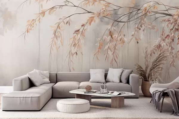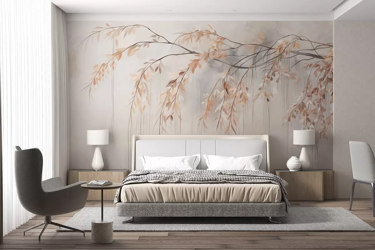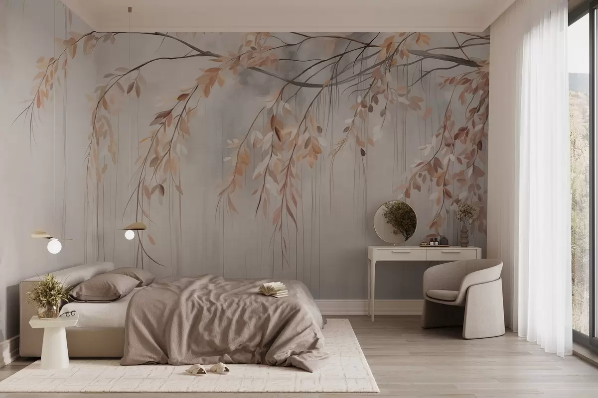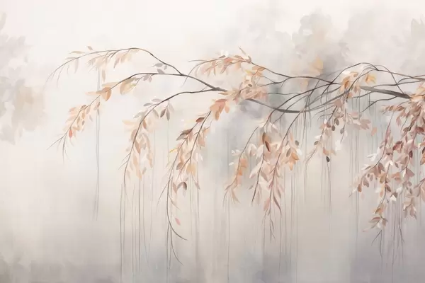Фототапет Клон със светлооранжеви листа, висящи надолу, светлосив текстуриран размазан фон, мек и деликатен стил Nr w09265