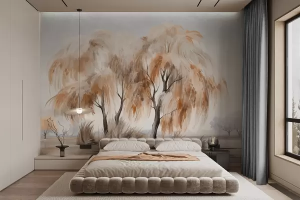 Фототапет Върби с кафяви и бели листа на брега на езеро, с трева около тях, в мъглив ден Nr w09268