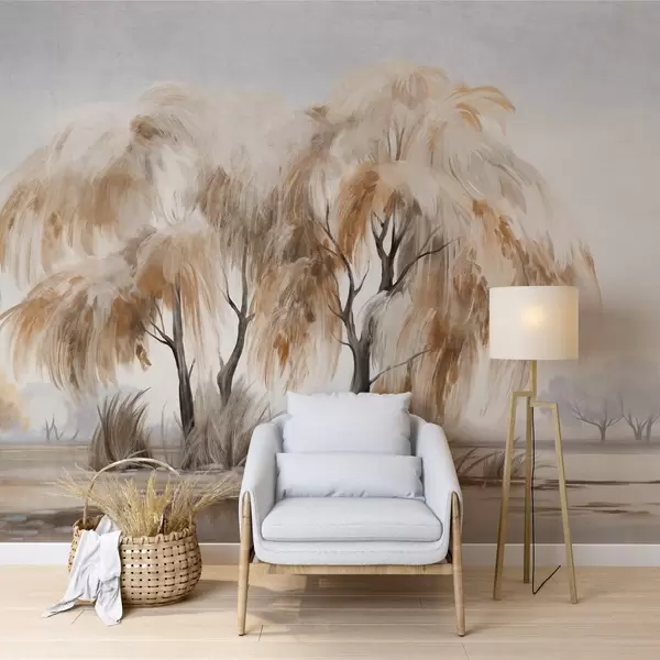 Фототапет Върби с кафяви и бели листа на брега на езеро, с трева около тях, в мъглив ден Nr w09268