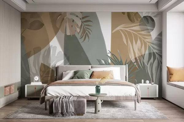 Фототапет Листа от монстера и палмови листа в десен с кафяви, бели и зелени цветове, тропическо настроение, абстрактни форми, декоративни Nr w09288