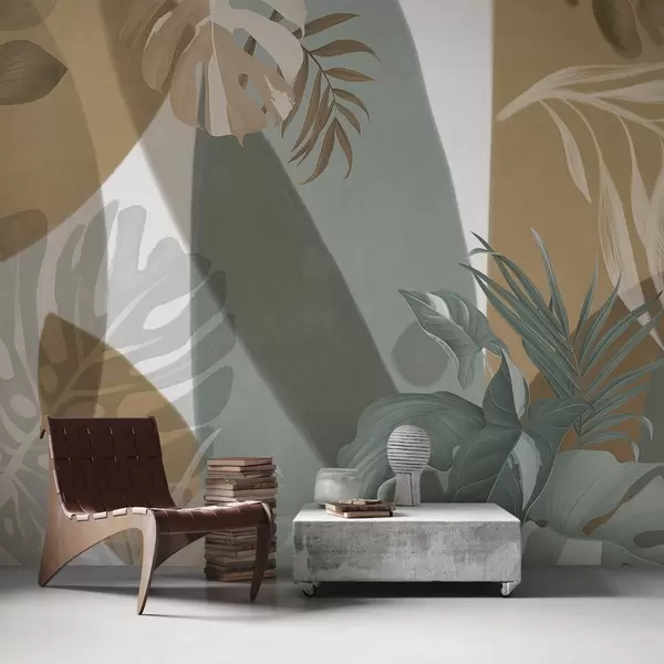 Фототапет Листа от монстера и палмови листа в десен с кафяви, бели и зелени цветове, тропическо настроение, абстрактни форми, декоративни Nr w09288