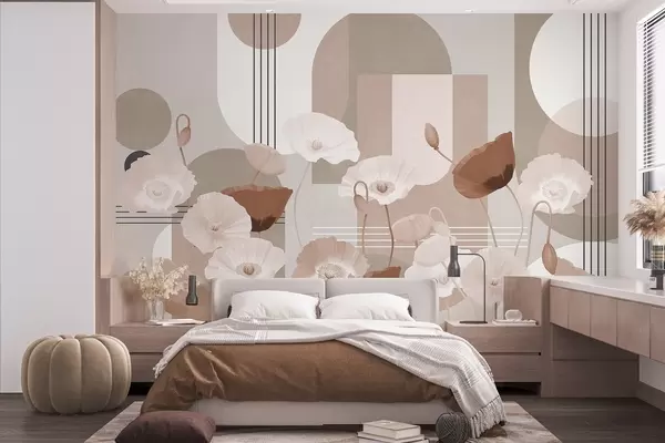 Фототапет Макове в бели и бежови цветове с геометрични форми на заден план, кръгове и арки, минималистичен стил, меки цветове Nr w09289