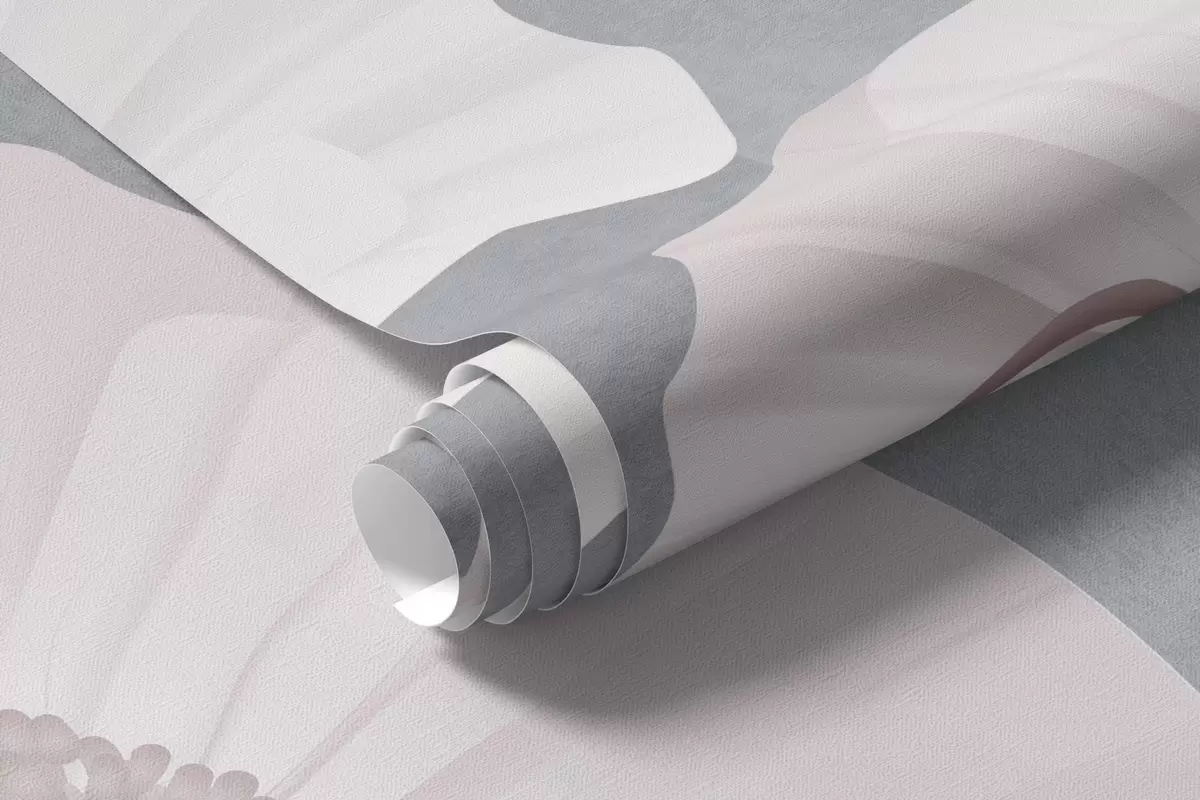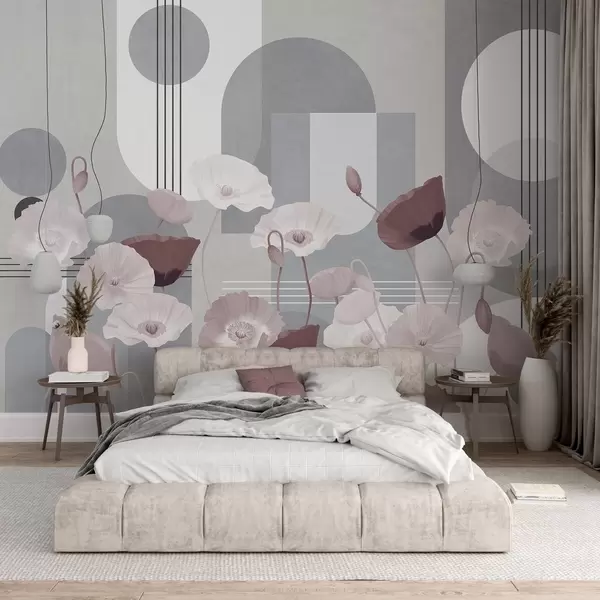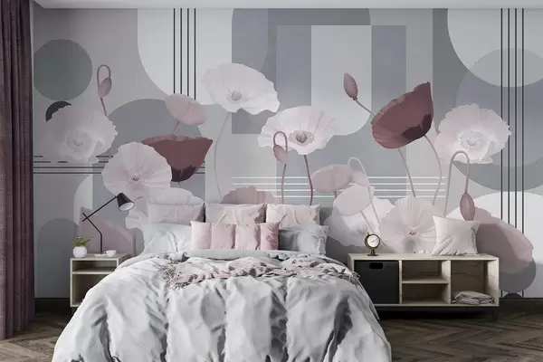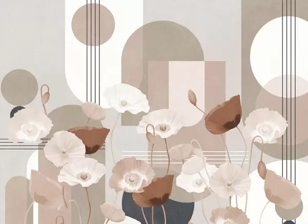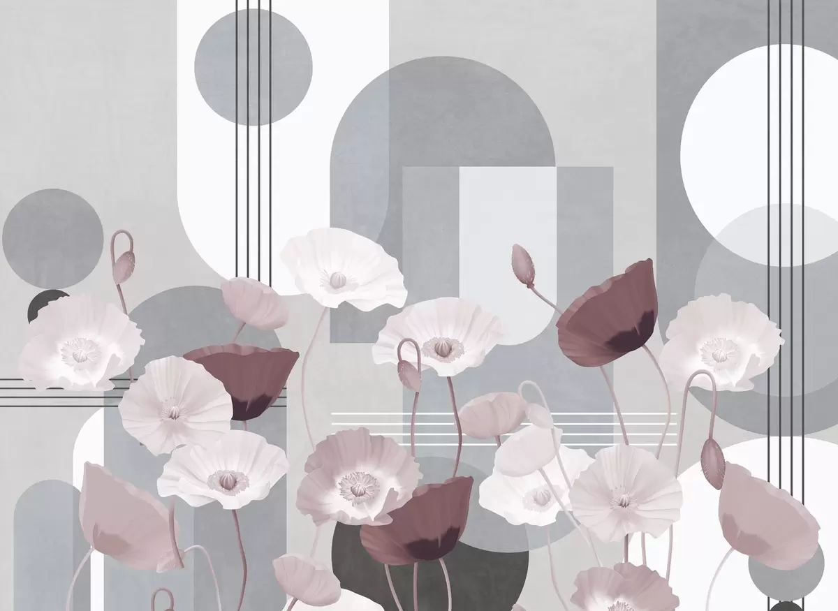 Фототапет Макове в бели и сиви цветове с геометрични фигури на заден план, кръгове и арки, минималистичен стил, меки цветове Nr w09289v1